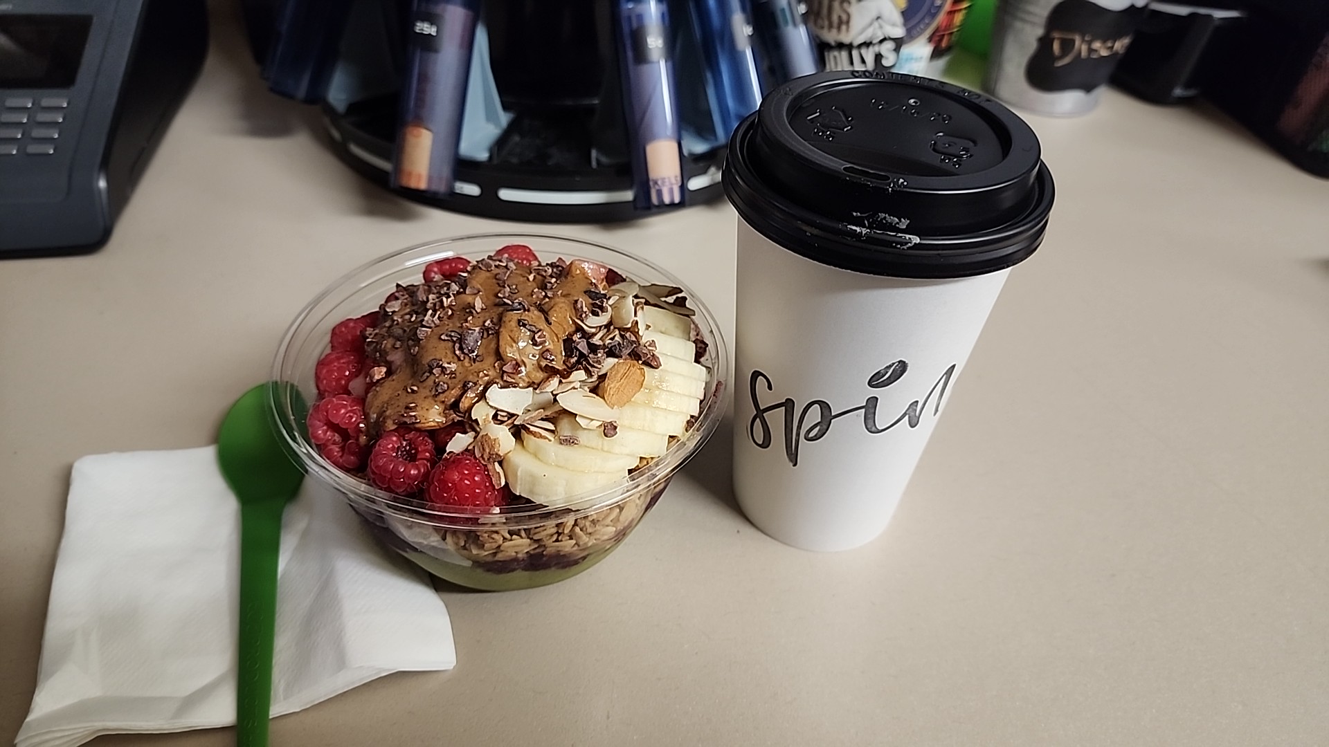 Read moreI had the pleasure of meeting Angel and Kenai who gave me a great experience when I went through this afternoon. I usually get the blueberry bowl, however I did not want to stain my mouth blue like it does. So Angel helped me pick out an alternative and I went with the strawberry bowl. Which was super helpful! And delicious! Kenai was the one who made my bowl and crafted it to perfection. I have sensitive teeth so I requested mine with less of the base and Angel recommended extra oats in substitution. So Kenai layerd it and it was so good! After my bowl was made and handed to me through the window, it looked absolutely beautiful! It was pink, colorful and had the perfect arangement of the strawberries and bananas. Topped with extra coconut and honey. My favorite! To Angel and Kenai, keep up the good work! Thank you for all your help and excellent service. 😃 If you're looking for a great experience with amazing food and drinks, Spin is the...