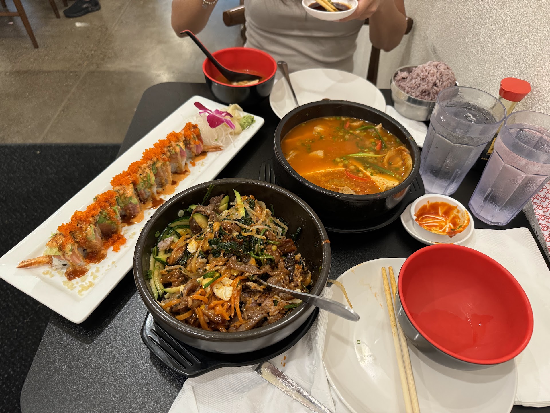Flavor (5/5): The flavors were fantastic. The sashimi was fresh, the sushi rolls were perfectly crafted, and the bibimbap and kimchi tofu soup had the right amount of spice and richness. Each dish was well-balanced, and everything tasted amazing.