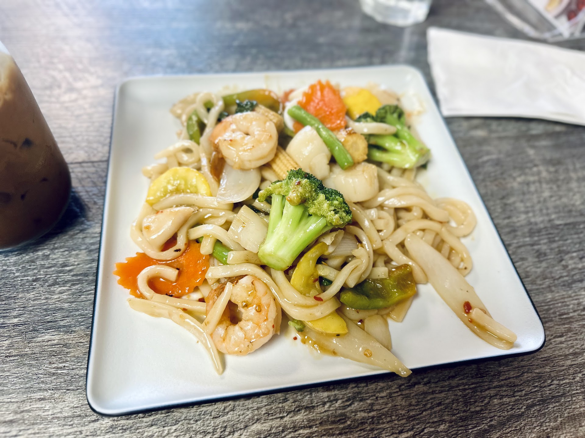 What I love about this place is its versatility. If you want a quick takeout, more mainstream American Thai dish, they do it. But if you want to be kicked in the butt with authentic Thai flavors, they also do that. I just ordered a simple basil udon this time because I was craving stir fried udon with seafood after a stressful doctorās appointment š Food came out piping hot, scallops and shrimp were fresh and tender. Simple and savory, hit the spot and reminded me of college days in the best way. You also get a free drink if you engage with them on social media, so you bet I took advantage! Iced coffee was a very sweet but satisfying balance to a more savory, saucy dish. Loved the extra attractive container it came in.