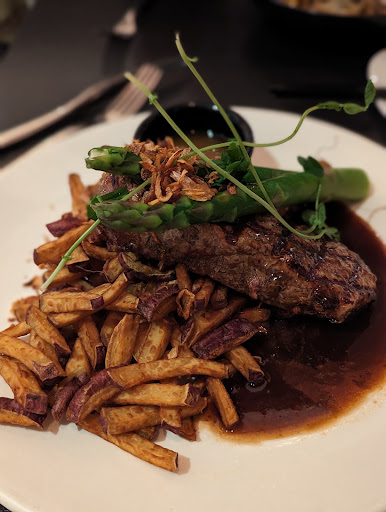 Hungry sad dogs. Tomorrow I go off to the UK to see my granddaughter and I am travelling on my own. My partner cannot get away and I will miss her. I asked her where she would like to go to dinner as a minor consolation and she said Azie so "her wish, my command" I booked dinner. To round the evening out I had also bought her a lovely necklace and the idea was to go here, have a great meal, give her the necklace and have a lovely evening prior to my departure. That was the plan but not the result at all. I have been to Azie a few times. Generally, it has been a good experience so I was not anticipating any issues. It looks like any issues that could have been experienced during other visits had all been saved up specially for last night. We arrive, are seated promptly but it degenerated from here, since my soup took about 20 minutes to arrive and our main courses were at least half an hour after I finished it. Three other parties arrived at tables surrounding us after we arrived; remember this bit if you please. Firstly, my partner is vegetarian, not an unusual dietary preference, and there are no vegetarian soups and only one vegetarian appetizer, which is literally a bowl of beans. She orders a jasmine tea to hold her over, which seemed nice enough, but it is hard to mess up Jasmine tea. At this point it all starts to go wrong. I order the clam chowder which in retrospect was gelatinous, almost gloopy and rather monochrome in taste. Then, we sit, and sit, and sit. I can't say it felt too long but that was down to the charming nature of my companion alone. I have ordered the strip steak and my partner the tofu poke bowl. As we sit we observe that all the three parties around us are tucking into their main dishes (some having ordered what we ordered) and we are still sitting, waiting, sitting, waiting. At this point I think I should say something, so I raise the issue with our server. The meals arrive with a few minutes, and we get going. Well that was a mistake. I had ordered my steak rare. What I got was indeed rare but also almost inedible. As I cut into it I thought my knife must have been blunt but no, the meat was fighting back. Having been subjected to the indignity of being cooked, it was asserting its displeasure by fighting dismemberment. The fries were soggy with a load squashed under the "meat". It was awful. I did not ask for a box as I have two dogs. I was not going to subject them to that steak. At this point we decide to go. I spoke with the manager and was refunded the cost of the steak but to be honest, that just compensated me for inedible food, not an evening, carefully planned being spoilt. Our server was charming. To be honest had the food that did arrive been delicious I would not be writing this review. However, food that, slow to arrive compounded with being appalling has prompted this review. I know from experience that Azie is capable of better. I may go back but thanks for nothing, spoilt evening, bad memory and hungry dogs.