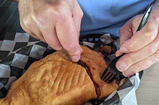 My main dish, the inside-out pizza, was a letdown. It arrived barely cooked, with the onions still raw, the pepperoni uncooked, and the cheese not properly melted. It felt like a major oversight in the kitchen. To make matters worse, the prepackaged tableware provided was so tiny and flimsy that it was practically useless. I went back and asked for replacement utensils and they had better quality plastic forks and knives behind the counter. The food was served in paper lined plastic baskets, which is not much fun to eat from.