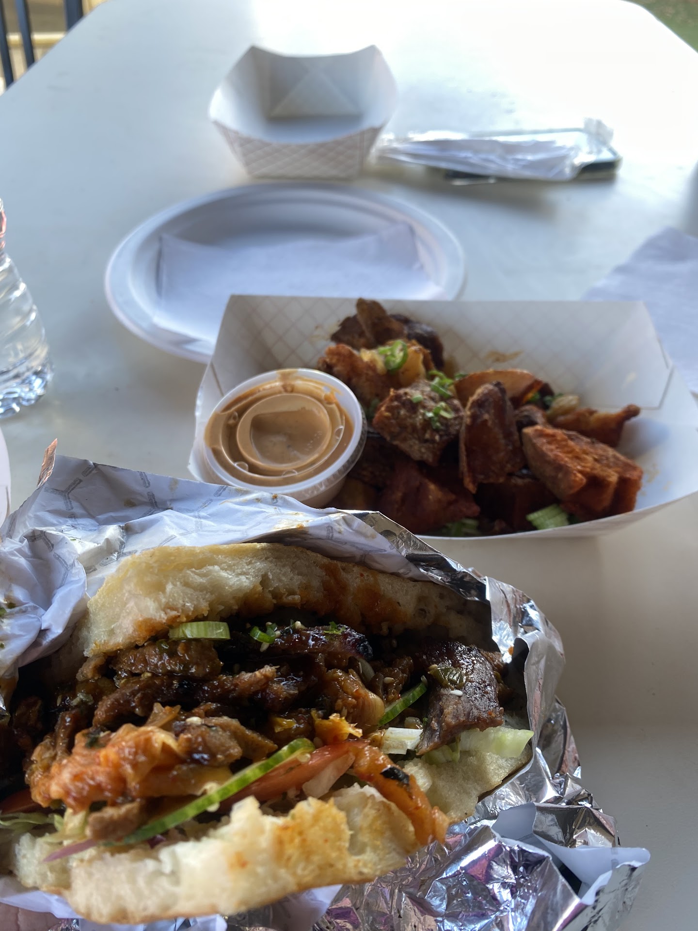 My husband and I absolutely love this place. We live in Kansas City, but visit the area often to see family. We come here every visit now because it is such a unique, high quality experience. The food is an incredible twist of street food fusion. Depending on when you get there, the wait time can definitely vary. If you're in a hurry, get there as soon as they open at 5:00. If you're not in a hurry, enjoy the experience. It might take a little longer, depending on how busy they are. But you can grab a beer upstairs at the Ale House, or hang out in the gazebo with a nice fire. As for the food suggesion, I cannot stress enough how good the bulgolgi dinner is enough. Really, anything that has the word bulgolgi in it was delicious. All of the handmade dips were phenomenal and really added cool flavors...
