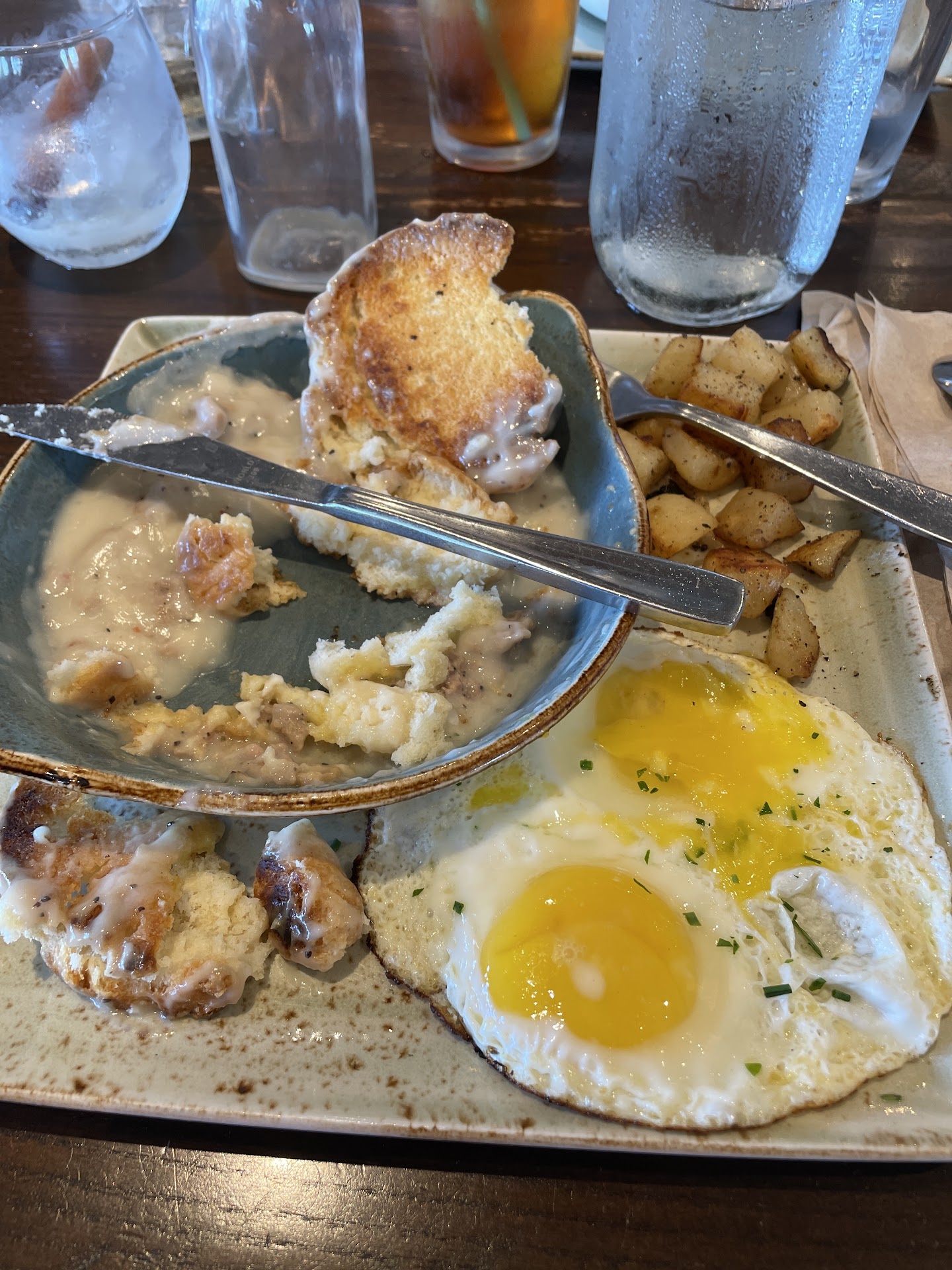 Read moreYour glassware STINKS! We had to ask for a second set of water glasses because they smelled like swamp water/dirty rag and the second set of glasses smelled the same. They were small juice glasses and they came from behind the bar. I saw other patrons around me with normal size water glasses with ice in them even - why did so many people around me get ice water in appropriate sized glasses will I was given stinky tiny glassware? It was so gross I felt uncomfortable ordering and eating food but my partner loves First Watch so I tried to play along. I ordered a cereal milk cocktail. It was watery and pre made. The glass bottle it was served in had a dirty cap. The walls next to the table we sat at had brown blobs on them like customers were wiping their fingers on the wall. I ordered biscuits and gravy. Gravy was watery and bland, biscuits were hard, dense, and dark on the bottom. The larger potatoes were undercooked, not fork tender. I did not finish my meal. Prices were high for food I found unpleasant and a drink I did not finish - I gave it to my partner. He was surprised when I told him it was alcoholic. One would never know based on the way it tasted. Service was fine. Building is loud and echoes a lot. I have no interest...