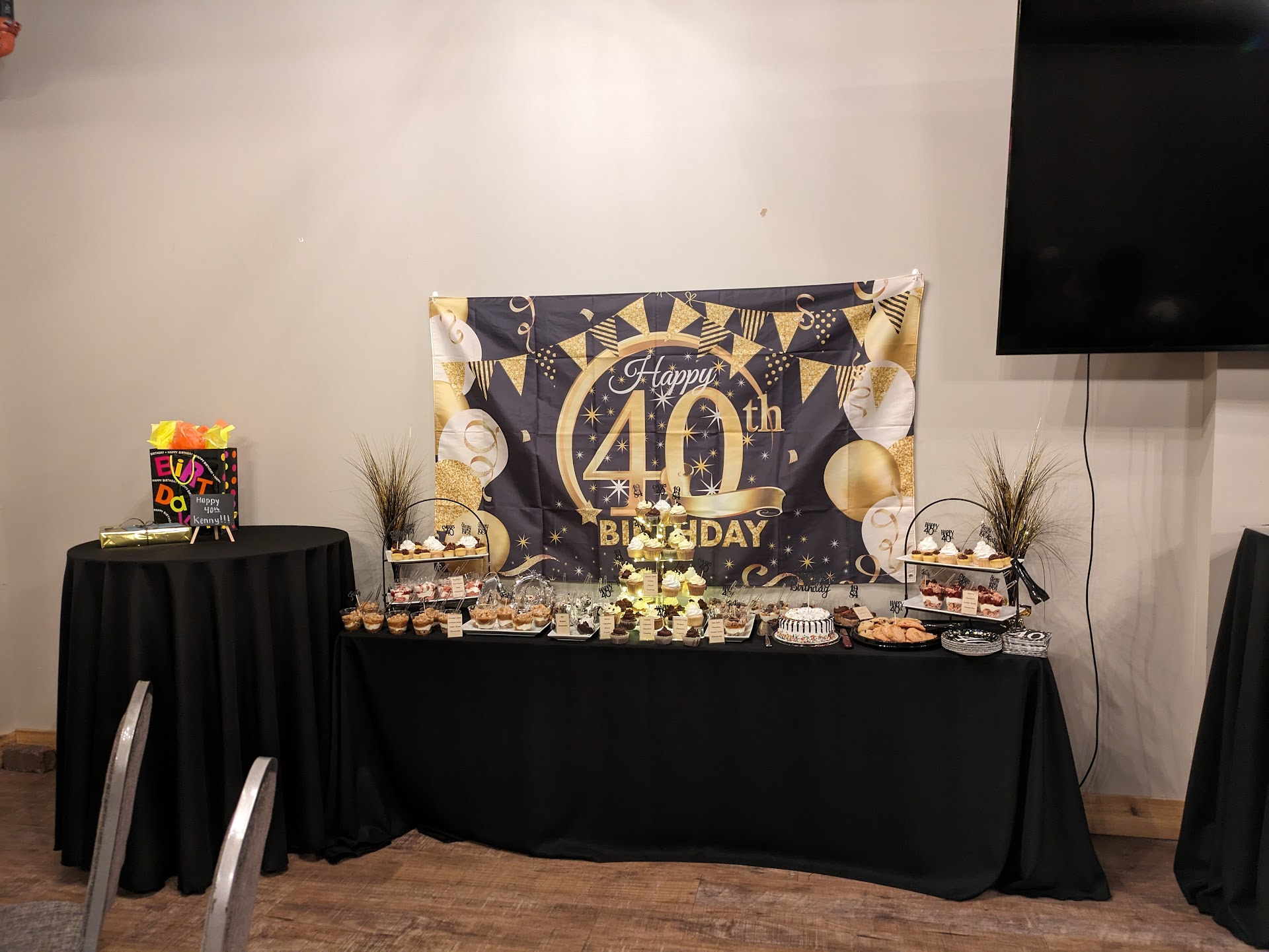 When I arrived at Foundry Social, my private room was decorated so beautifully! It was basic but beautifully laid out with black linen tablecloths, gold bar rustic centerpieces and a perfectly placed light curtain wall. My black and gold decor fit in seamlessly. I offered help from many employees while setting up and even decorating! They were genuinely so kind throughout!! The manager came in multiple times to check on us and complimented my dessert display, we were allowed to bring in our own desserts.