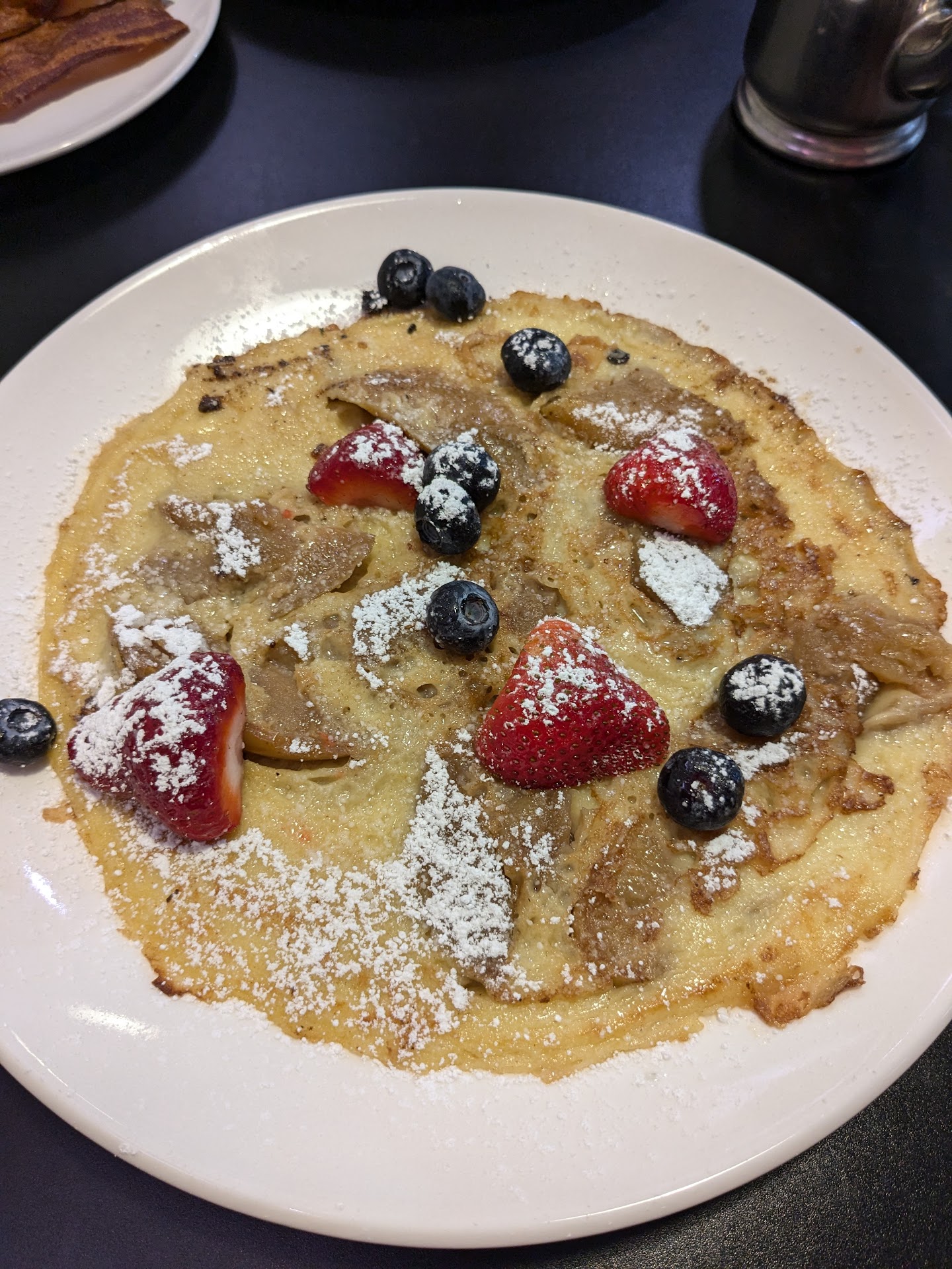It's an apple potato pancake with blueberries and strawberries sprinkled on top (picture that is posted). The pancake filled the whole plate! It's not very thick and it has almost a custard taste to it. It's almost like a big crepe. It was very,very good! It's on the sweet side, if you like that for lunch. I have a sweet tooth, so I thought it was very good! I loved every bite!