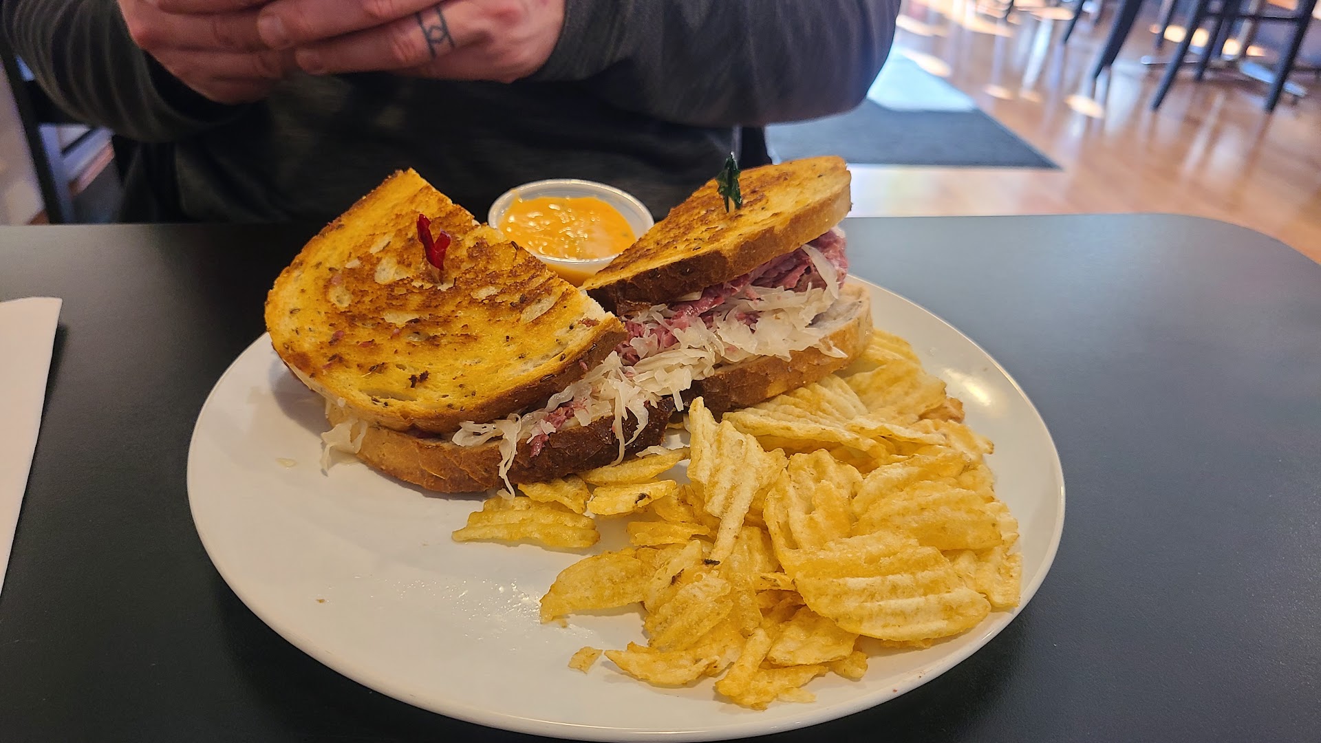 The Food. My husband had a Reuben. Excellent. "Best Reuben he's ever had", i quote. I got the Reuben on a Latke Sandwich. It's instead of bread it's on 2 potato pancakes. Delish! I'm not a big fan of sauerkraut but i liked their sauerkraut. The cornbeef is the thinsliced almost shredded. The best!. Inhad left overs because of their portion but I eat like a bird anyway in the first place. My husband finished his. Photos shown. I ate mine not thinking of taking a photo first. The wait wasnt that long but i was starving when we went there so i just dug in when i got my meal not thinking about it.. We downed the food with sweet tea....