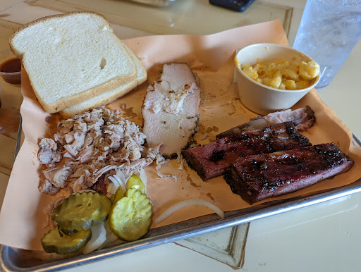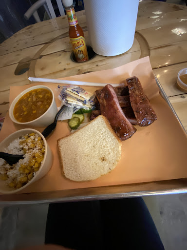 I tried a half slab of ribs, pulled pork, turkey, and Mac and cheese. Everything was just ok and a little dry. Pork didn't have much flavor without the sauce. Turkey was dry. Ribs did NOT fall off the bone. I had to pull with more force than you want to and they were a bit tough. Ribs also have a brown sugar glaze so be ready for a sweet sugary flavor not so much smoked flavor. Super cheap slices of plain white bread. Mac and cheese was a bit dry and not very cheesy.
