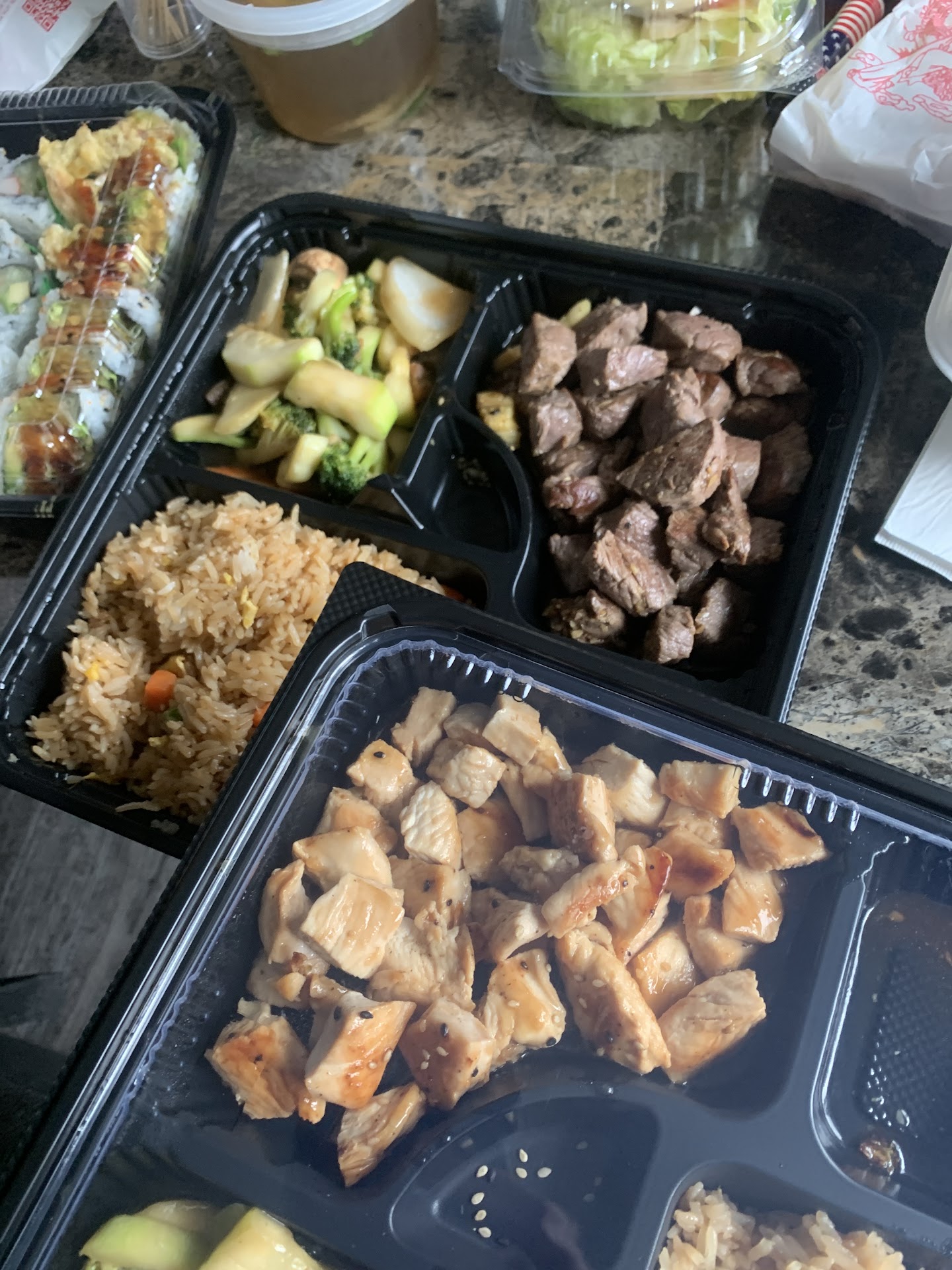 The outside of the building is not the most eye catching, but we decided to try the location out for Fatherās Day. Firstly, we booked a reservation. While it is not required, we wanted to make sure we had a spot with it being Fatherās Day. When we walked in, the lighting was dim, which we appreciated. Friendly wait staff with minimal customers when we arrived at 2pm. Plenty of parking available. For anyone wondering, you do not have to purchase hibachi items when sitting at the hibachi table. The server was attentive to refills. Now on to the food: the portions are definitely worth the cost. What we ordered.. Shrimp tempura-came with miso soup, salad, and rice. There was also fried vegetables included as well: broccoli, onion, sweet potato, and zucchini. 5/5 Calamari hibachi dinner entree: fried rice was picked, assortment of veggies, 2 pieces of shrimp and calamari pieces. Do not get this if you are not a fan of plain/buttered calamari. Also came with miso soup and a salad. We enjoyed it. 5/5 Salmon hibachi dinner entree: 2 pieces of salmon. Udon noodles was picked for this one. Veggies. Miso soup with salad (it comes with a ginger dressing). 5/5 Steak and chicken hibachi dinner entree: ordered a medium steak, which honestly we should have ordered it medium rare. The flavor is still there though. Chicken was cooked perfectly. Fried rice, veggies, miso soup, and salad were included. Also included with all the meals: yum yum sauce and another sauce that I can not remember the name of. Our cook was definitely entertaining and respected our wishes of not wanting the liquid squirted in to our mouths. We were welcoming to the veggies though. He was child friendly as well! We did get seated with another family, but it was great! Will definitely go back to try the other selections.