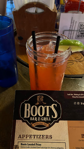 Boots bar & grill was were our party of 15 landed after an walking tour of Medora and then a scenic drive threw the Theodore Roosevelt Badlands National Park. (detailed review of park coming soon) Boots was filled but our large party was seated relatively quickly as another table cleared. I didn't catch our lovely and very attentive servers name but she knows who she is you killed it! Thank you from finding extra chairs, then finding more high chairs for the gaggle of small children we had, taking time to double check the orders were correct. Thank you. My buddy Danny got the ribeye and he enjoyed it very much. Couldn't finish it though... poor little guy🤣 I had the Traeger smoked pulled pork sandwich with seasoned fries much like the ones served at Rallys or Checkers, scrumptious! The sandwich size in itself was ok for the $13 price tag. The meat was perfect and not totally drenched in tons of seasoning, sauces and slaw. The slaw paired excellently with the pork and the less is more sauce attitude on the great sandwich. Definitely would recommend. Nobody at the adult table had a bad thing to say about the food. Some got the fish and chips, brisket, shrimp skewers, Dakota walleye (she said it needed lots of lemon), and Your Not my Boy Blue. The kids had nuggets, quesadillas, stuff like that. They said the Bloody Mary was very good and satisfying, garnished both with a thick slice of bacon, and a dill pickle spear. The decor looked to be a homage to the Cowboy Hall of Fame right across the street. Mens restroom were in between clean and getting dirty but again it was packed. Thank you Boots Bar and Grill, and especially our server! When I get your name I will update...
