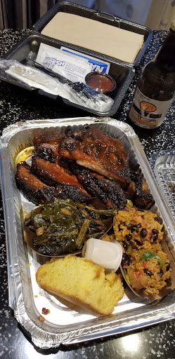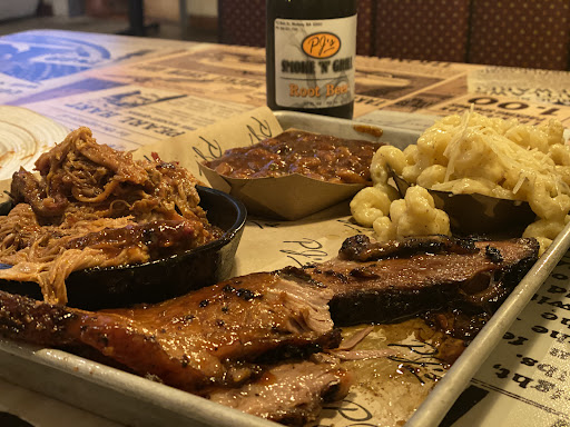 On to the food. My daughter and I were so enthralled with the menu, we wanted so many things, we decided to order a variety and save half for tomorrow's dinner. Whole meal was $61 dollars, that's $15.25 per person as 2 people will be eating what we ordered for 2 nights, even McDonalds cost more than that nowdays! So the food is priced great. We got 2 apps, the boneless chicken in peach/bourbon sauce and sweet n heat pork belly. The peach bourbon sauce was amazing, and just the right amount. The chicken is not breaded and fried, which we loved. Nothing but tender chicken and delicious sauce. The pork belly was chewy, tender, flavorful, and cooked to perfection. The sauce wasn't oversweet or overly spicy... just right. Then we got the 2 meat 2 sides combo. Smoked turkey (which was breast) and brisket. I was nervous about the turkey, some places it tastes like you're literally eating smoke. The smell and flavor permeate everything. PJs turkey was smoked with just the right amount of restraint. Kissed with smoke so you could still taste the turkey. Crisped edges and tender turkey, lots of it. The brisket was sauced just right and sliced thin, it fell apart on my fork. Our sides were cornbread and dirty rice. I had 2 small issues here. There was only one chunk of cornbread, which was lightly sweet, and moist beyond expectations. We wanted more. The flavor of the dirty rice was fabulous, but it had no salt. For me, that is a 100% forgivable issue, I just added salt and it was perfect. Again I wish there had been a bit more. My daughter really wanted baked beans, so we got a separate side order. It was a very generous portion, beware they have a nice spicy kick! 10 out of 10 we will return here, there is plenty of parking, the server who took our order on the phone was very kind, polite and efficient, he was in person too! Good BBQ is hard to find, we've tried lots of BBQ places all over MA. This is by far the best as the food is delectable AND affordable....
