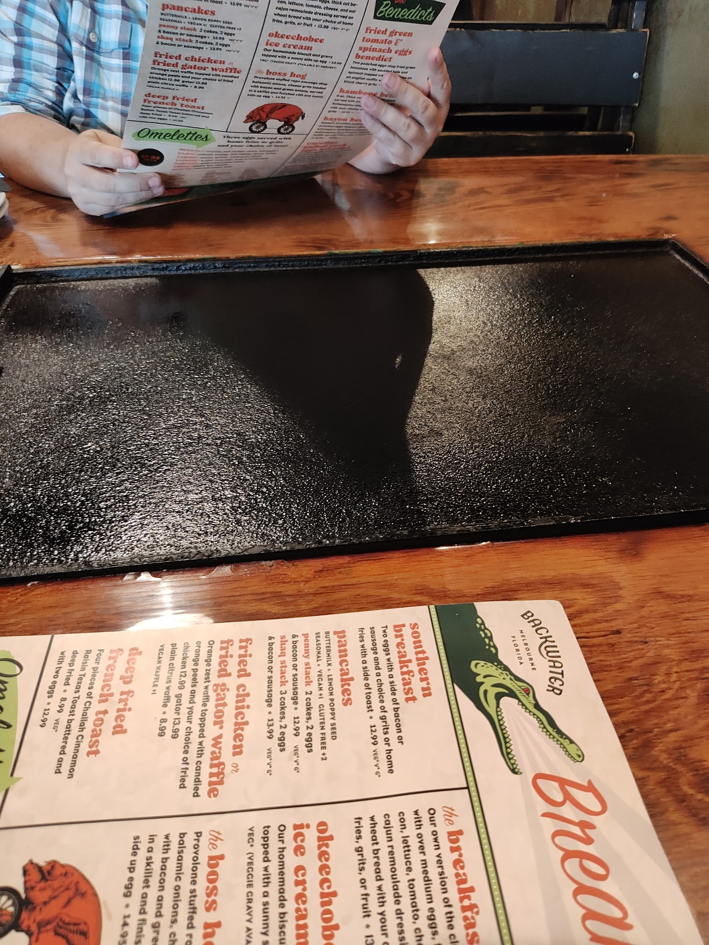 Read moreBlackwater's is a nice place with a different slant to breakfast. They have tables with griddles in the center to allow you to fry your own pancakes. For a very reasonable $7, you get a 12 oz squeeze container with batter, which will make three 12 in plate sized pancakes. There are 4 different varieties to choose from: buttermilk, vegan, gluten free, and seasonal, which today was apple cinnamon. You can get other toppings and add-ins, like blueberries or chocolate chips for an additional price. There is also a full breakfast menu with the Backwater spin, like waffles and fried gator bites or chicken, and a lunch menu. The only downfall to the restaurant seemed to be their pricing of the add-ons for pancakes. Look at the menu and you see a side of bacon, sausage, or two eggs are $6 each. Home fries are $3.50 and toast $2. You get 2 slices of bacon for that $6. Yes, it's thick sliced and tasty, but a pound of thick sliced bacon gets you 10 pieces at a minimum, in some packs 12 to 14. That puts the bacon, somewhere in the $25 range a pound. I doubt the restaurant's paying that much for it. Then to boot, if you order the Southern Breakfast, you get your two eggs, bacon or sausage, home fries, and toast all for $13. That's a savings of $3 from a la carte. It's prices like this, that make us leary about going out to eat these days. Although, $13 is the typical price this morning for breakfast, I think if everybody took a hard look at how much it costs for their supplies that they buy in bulk, they could shave a couple dollars off the price, and they'd bring a few more customers in. Because words gets out that it's worthwhile venture. This would give them the funds to meet all their overhead requirements. So, shop wisely. Otherwise the experience and especially the wait staff...