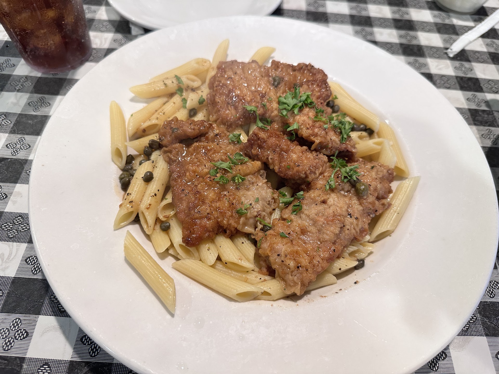 Our waiter today is a young man named LJ, who is incredibly quick, efficient, and professional. LJ is certain to make the 3Q best service list. I asked LJ for an order of their Fettuccine Alfredo, which, I have heard, cannot be ordered in Italy as it does not exist there. I also ordered my Italian barometer dish, Veal Piccata. While waiting for the food, I took a look around the restaurant and I must mention that I like what they have done with the place. It has the typical checkered tablecloth found in every "family" Italian restaurant, but it does not detract from the rest of the pleasant, inviting, and open decor.