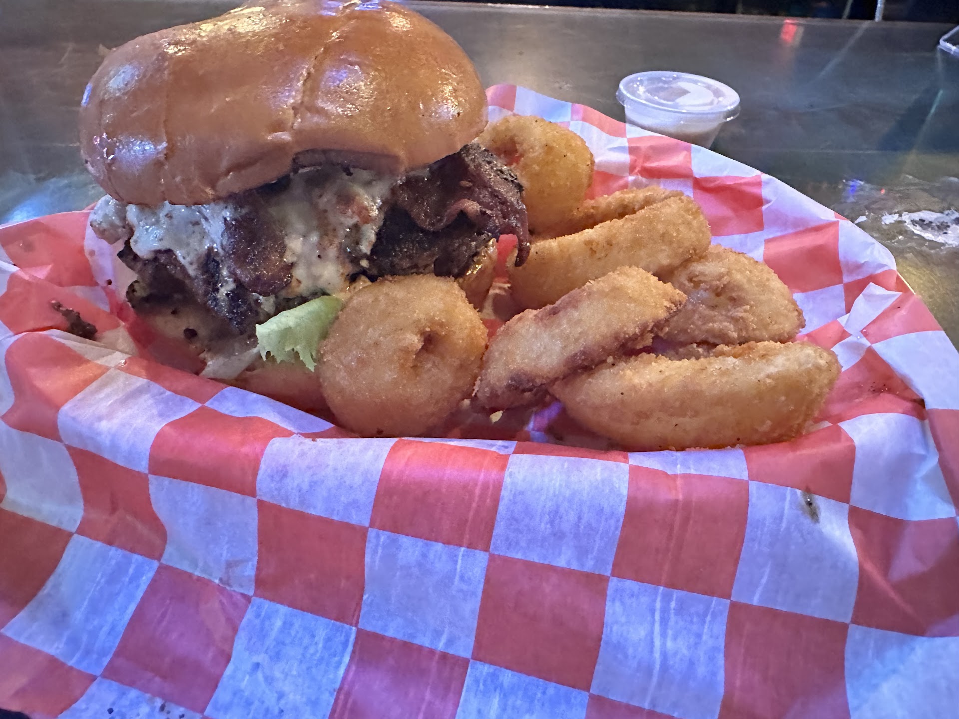 After one bite, I knew that this would have been a Five-star burger if the staff's attention wasn't diverted from their task at hand. I don't begrudge them this, they did what they had to do which is to look after the care and well-being of their customers; however, it did cause the burger to be over-cooked. Even so, this gigantic hand-made-to-order burger was popping with flavor, and the toppings were the best I've encountered on a burger. Many chefs overuse bland spices on ground beef, having a hebetative effect on the dish as a whole. This was not the case here. The meat was fresh, the bacon was delicious and the Blue Cheese exceptional. If it wasn't slightly overcooked, it would be well worthy of "Top Burger". The side of Onion Rings were perfectly cooked, which isn't easy due to their varying thickness and size.