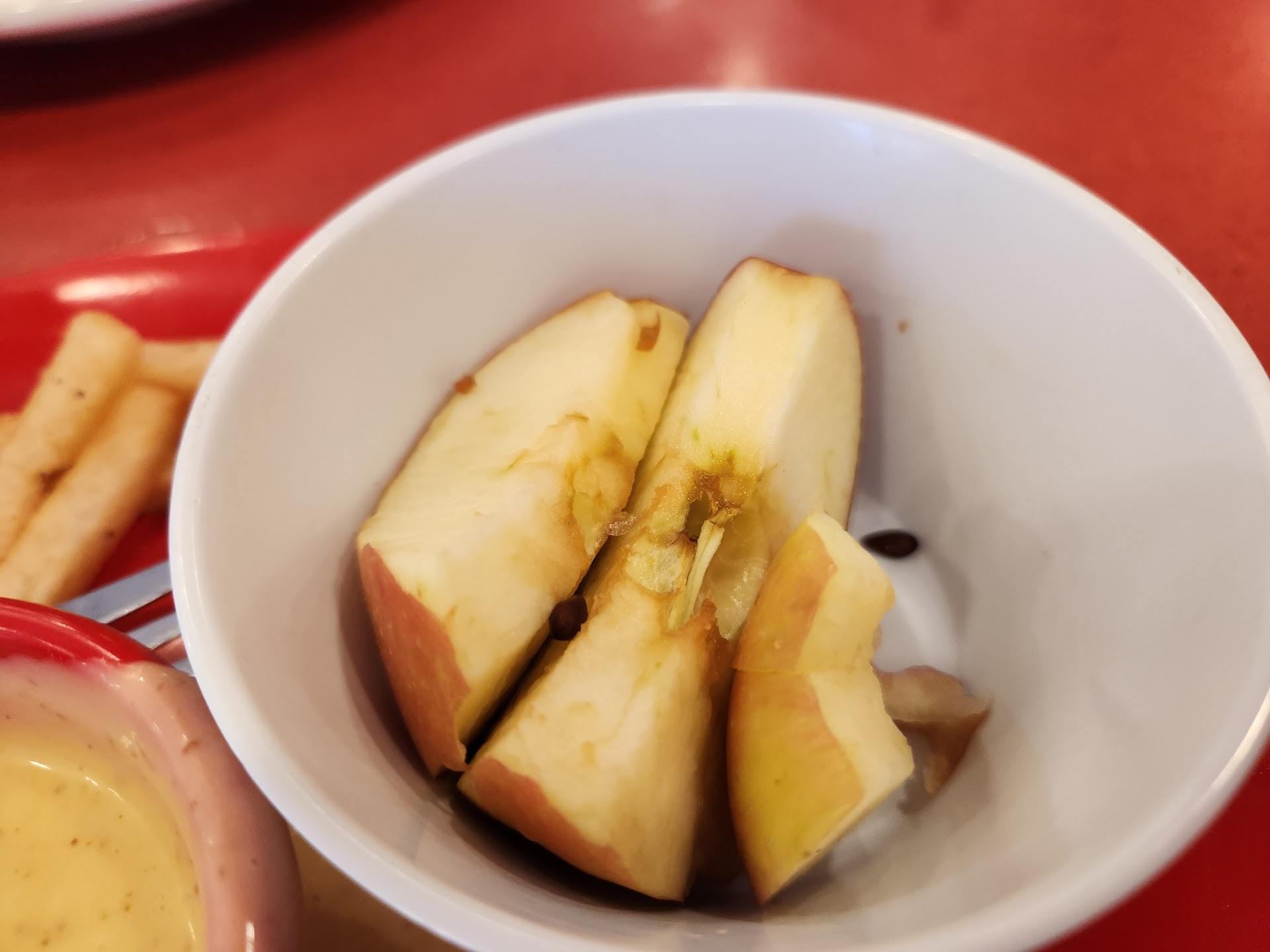 Read moreMediocre at best. The menu was atrocious. First of all, they were filthy. Covered in dried food. Gross. The organization of the menu read awful. One page had things on it that you couldnt find in the main part of the menu. The waitress had to get a "menu insert" to make it make sense. I never expected it to be amazing since Friendly's never really was, at least for food anyways. Decent enough but not award winning, which is fine. I knew that. You kinda go for the ice cream anyways. Ice cream is ice cream, can't really mess that up. Or can you?? But getting a sloppy cut apple in my child's meal was very disappointing. The presentation of the food was sloppy. The coleslaw was thrown in the side bowl so carelessly that it fell off the side and into the food. The apple, well, you see the picture, disgraceful. The happy ending sundae for my child was melted and didn't look like a happy face. More like a melting owl. I'm not sure what went wrong with the fries but five orders of fries should come out on five plates. It's not rocket science. We were missing one side of fries and it took awhile to come out. The place wasn't that busy when we showed at all, one other solo customer. They had just gotten done a rush, said the waitress. But the place was dirty and mangled and there were no efforts to clean it up by the staff. The waitress seemed blah. Nice enough but not interested in the job. When we asked for water refills, she came with a pitcher and just left it on the table for me to do myself. We won't be back. It's a shame. We wanted to share a spot from our childhood with our kids and it was disappointing. And I didn't even have that high of...