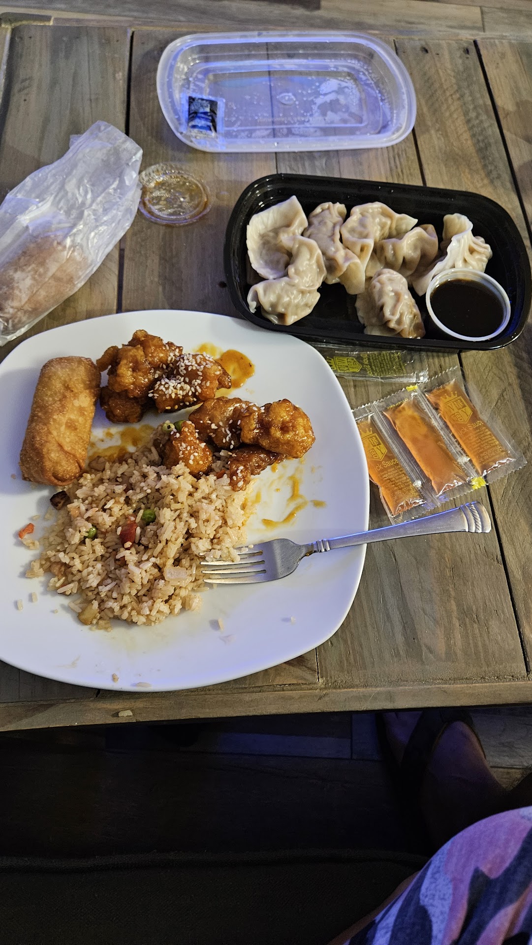 The portion sizes were good, but the quality was very lacking. The chicken lo mein tasted of noodles with soy sauce, and the chicken was gelatinous. The fried dumplings had no flavor, but was cooked to perfection. The appetizer plate which featured crab Rangoonâs barbecue ribs, egg rolls, chicken wings, and chicken teriyaki were as follows: the crab Rangoonâs were smaller than usual ones and were quite tasty. The chicken teriyaki was tender and flavorful, as well as cooked to perfection. The egg rolls were dark, possibly due to older fry oil and lack taste. The ribs tasted as if they are boiled and then tossed in sauce. The pork fried rice which came with the chicken lo mein tasted of old white rice and was tough to chew.