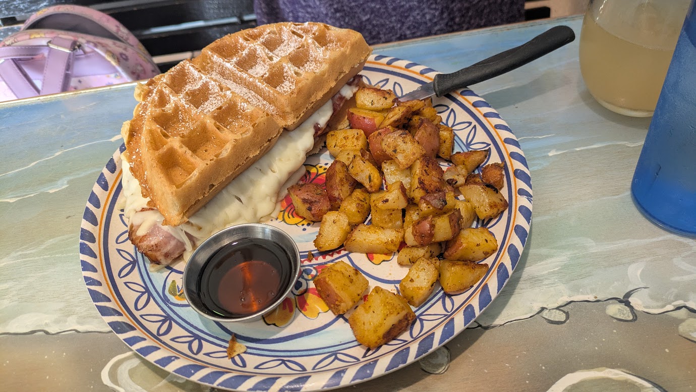 I had the The Waffle Cristo (ham and provolone cheese in a waffle sandwich with habanero maple syrup, dusted in powdered sugar, served with roasted potatoes). So good. Waffles made a great sandwich bread. The ooey gooey cheese, the slightly salty ham, and spice from the habanero syrup, this just all came together into an amazing little dish.