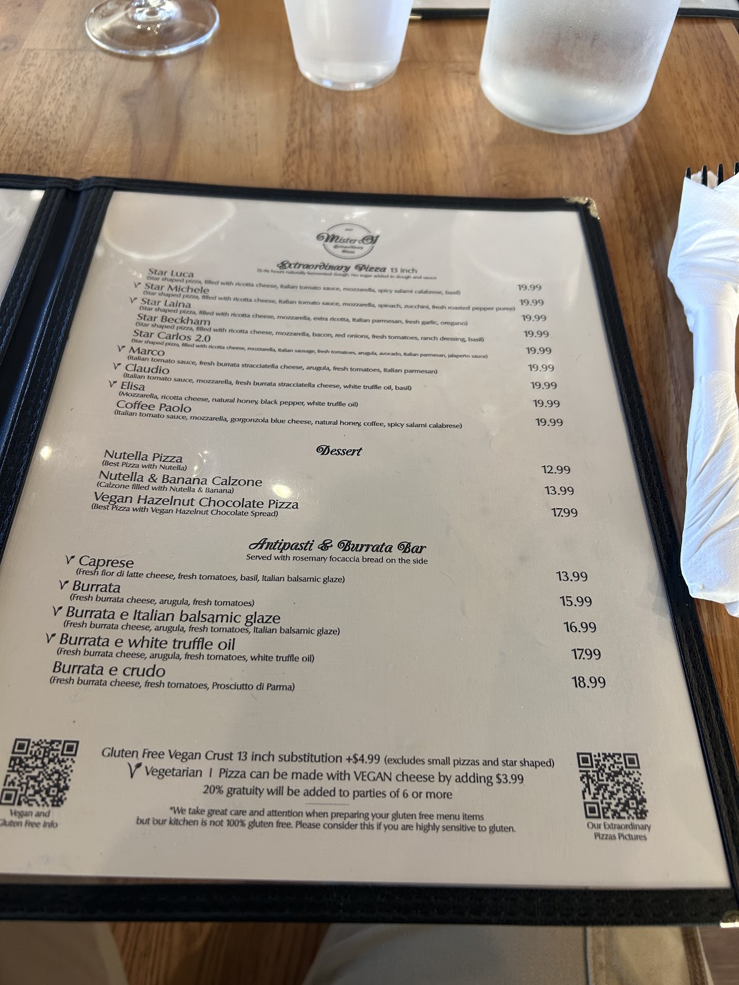 Read moreTook our 2 oldest Granddaughters and their boyfriends there for dinner. Sat outside because we chose to. Our waiter was more worried about 'chatting up' other single girls than he was about waiting on us (and my husband who was paying is a big tipper). 5 of us were served in close proximity, but one wasn't served at all. Finally my husband flagged him down to find out what happened to her pizza. "OH, it got burned, we had to make another." No offer of warming ours up, tho, or some more to drink. Finally hers came out, and ours were cold. My husband, again stated to him that ours were cold. He litterly shrugged and said, 'sorry' and walked away!! So, we all started eating. The crust is VERY thin, so there was no warmth. It was OK, but I certainly wouldn't pay $17 for a 13" pizza there. Then the waiter was going to bring the bill, but the girls wanted a Nutella pizza for dessert. Now THAT was delicious, but only 3 of us could eat and he never asked anyone else if they wanted anything or even more drinks. Then he came back with the bill and stood in front of my husband waiting for a tip. There was already 20% added on. He kept waiting, my husband said, "That's it." He made a huffing sound and walked away. Before we were able to get up to leave, he came back, walked around the table and placed a business card in front of the others with his name written on it. "Tell your friends to come and ask for me!" Our younger Granddaughter (18) and boyfriend almost in unison said, "We would not tell our friends to come here or to see you!" I was surprised, because she is usually the quiet one....but it was HER pizza that held everyone up (good manners) and she was upset with the waiter for not letting us know or offering to heat them up!! I called and reported our experience with the Manager and 'Conner'. Never heard back from him, so we will never go...