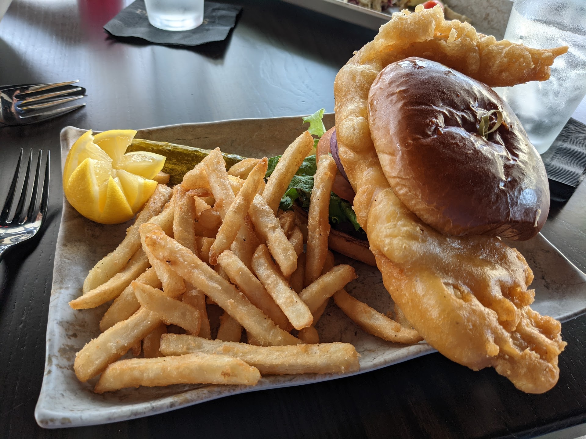 For our mains, my wife got the warm spinach salad and I got the hog fish sandwich. Both were well prepared and delicious. But once again, poor decisions were made to sacrifice the enjoyment of the food over the plating/presentation. My wife's salad was in a steep funnel shaped bowl with the top rim at a tilt. It was certainly lovely for presentation but the narrow bowl base almost caused the whole thing to flip on multiple occasions when she tried to cut the contents of the bowl. Additionally, the slanted rim eventually resulted in her fork rolling down the edge and flipping into her lap while getting a drink. My hogfish sandwich (picture attached) was delicious - first time having hog fish. However, the ridiculously oversized portion of hogfish was a logistical nightmare. I had to resect the ends of the fish that were sticking out off of the bun, You could have made three sandwiches with this thing. Then having cut the breaded filet open on both ends for the sandwich - every bite consisted of the meat sliding out of the breading and onto the plate (thankfully not on my pants again). The only negative comment on the preparation was that the tempura was a little soggy and contributed to the mess. It would have been better with a properly sized filet for the sandwich that was perhaps a little thicker. If I order this again, I will simply discard the bun and go straight into fish & chips mode.