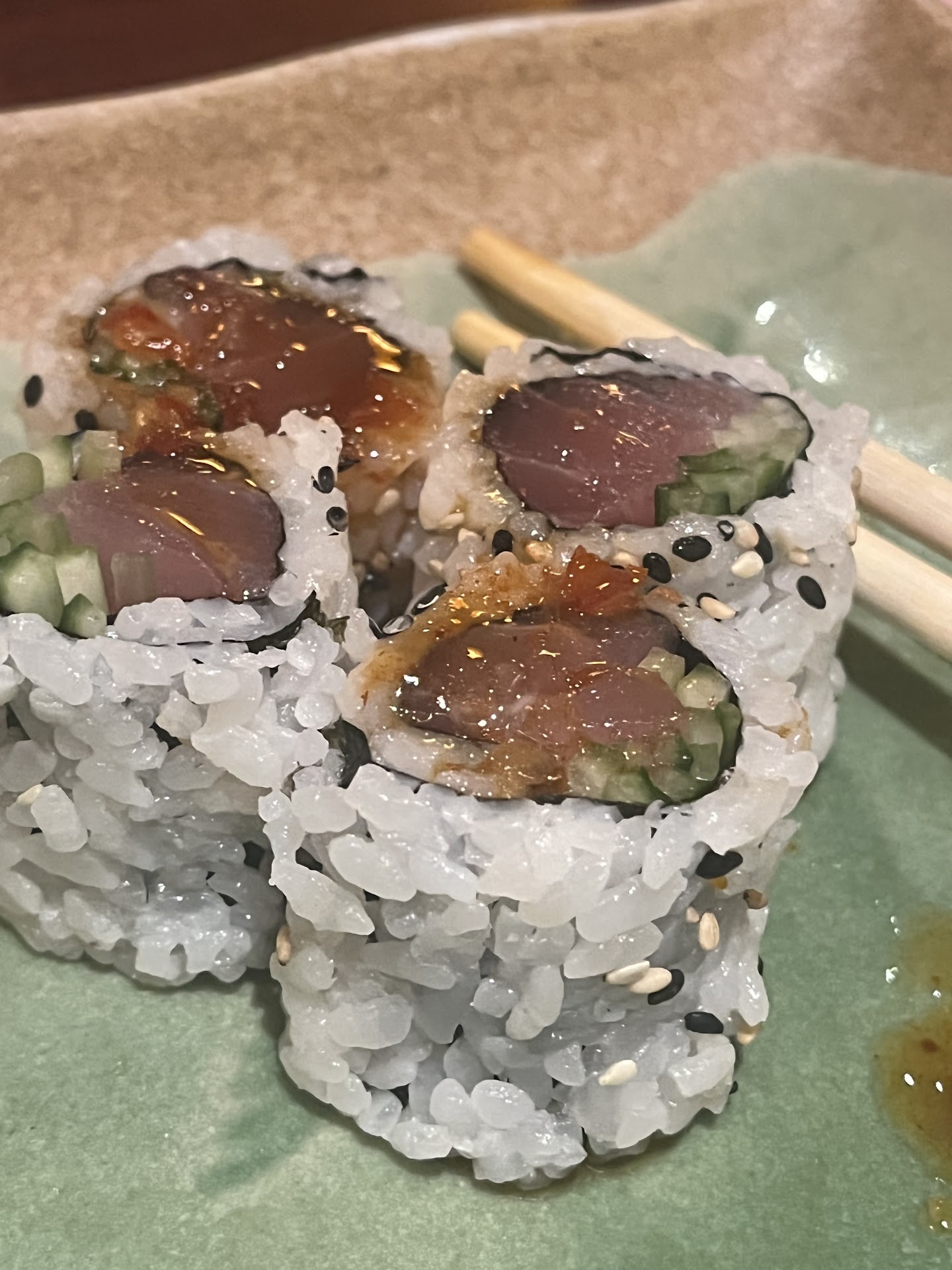 I taste the sauce, it’s duck sauce, and it’s ruined the roll. It’s absolutely in no way what I ordered at all, a second time. More time passes without him checking until I can finally order a different mediocre roll to replace it. No apologies or care from the server. If you work in a Chinese restaurant, you should know that this sauce is in fact a duck/chili sauce. That is BASIC information. Don’t call it a basil tuna roll if there’s zero basil on it. Twice.