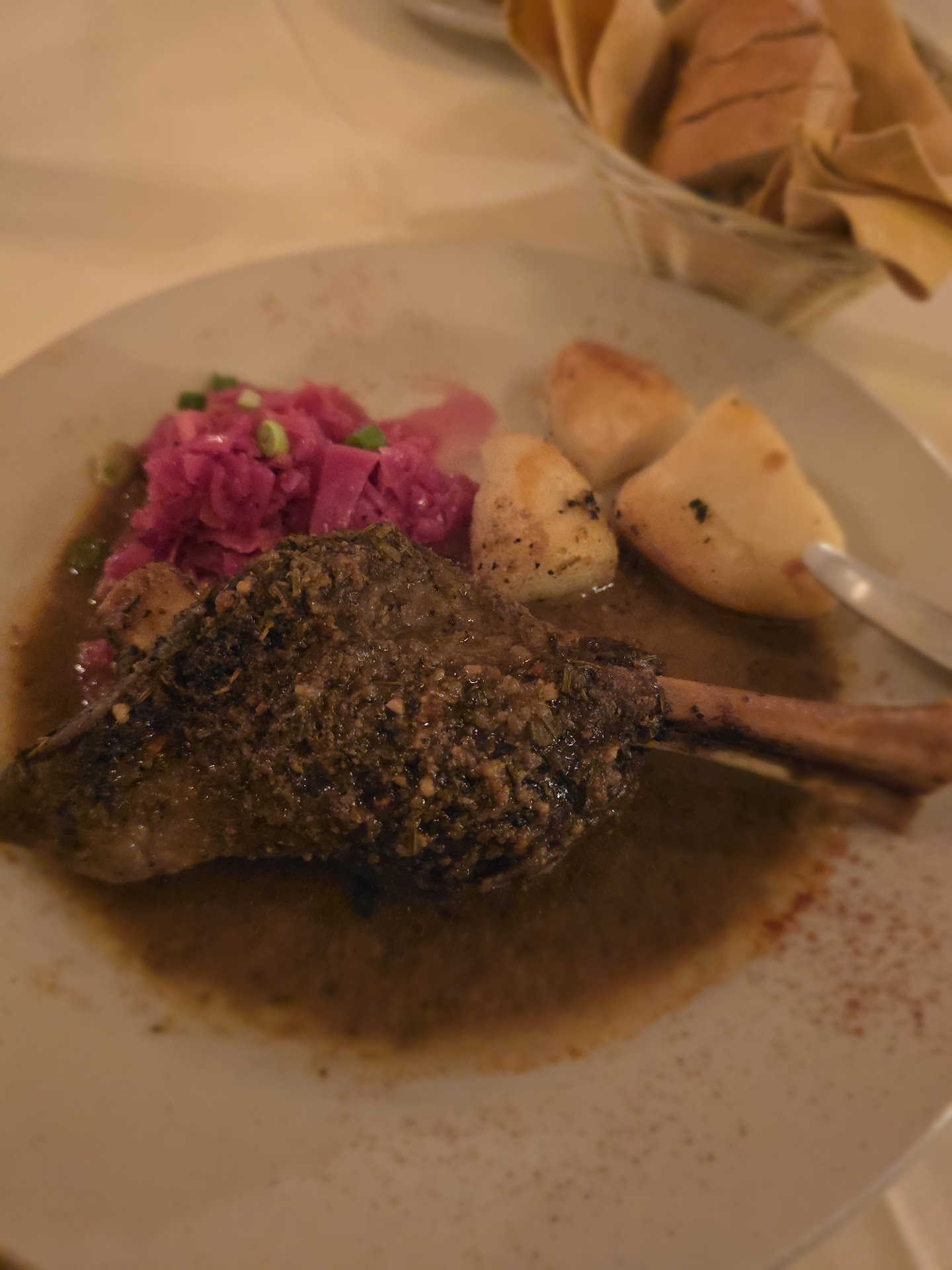 My meal...this is a meal I will never forget. I got the lamb shank. Guys, this thing came out piping hot, and was still hot as I cut through it in the video after I had already eaten half of it. Served with some kind of cabbage slaw, which was fantastic, as well as some potatoes which were cooked to perfection. They were crispy and flavorful, salted just right. But that lamb shank. Wow. The flavor of that piece of meat was indescribable. Just bursting with flavors that complimented the meat so well, and it was so tender I didn't need a knife to cut through it.