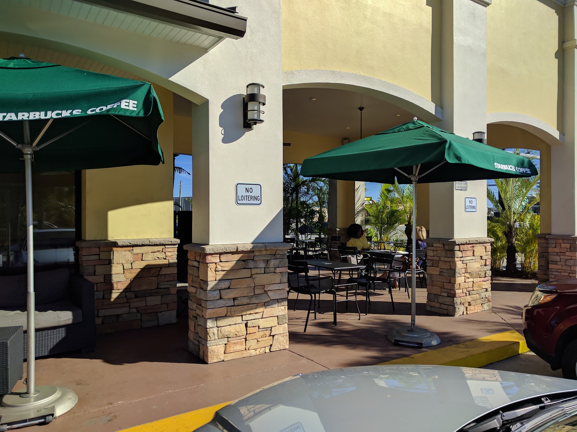 Read moreIt's the best Starbucks I have ever been to. I go here a lot to sit under the shady outside patio. Enter by the parking lot on Eau Gallie. Trying to turn in from the turn lane is taking you life into your own hands. Just make the left from US 1 and make a left into the parking lot off Eau Gallie. The staff rotates like any Starbucks. But they're always quick and well managed. Bathrooms are always clean too. Inside is small but hey, we live in Florida. Do you really want to sit inside?