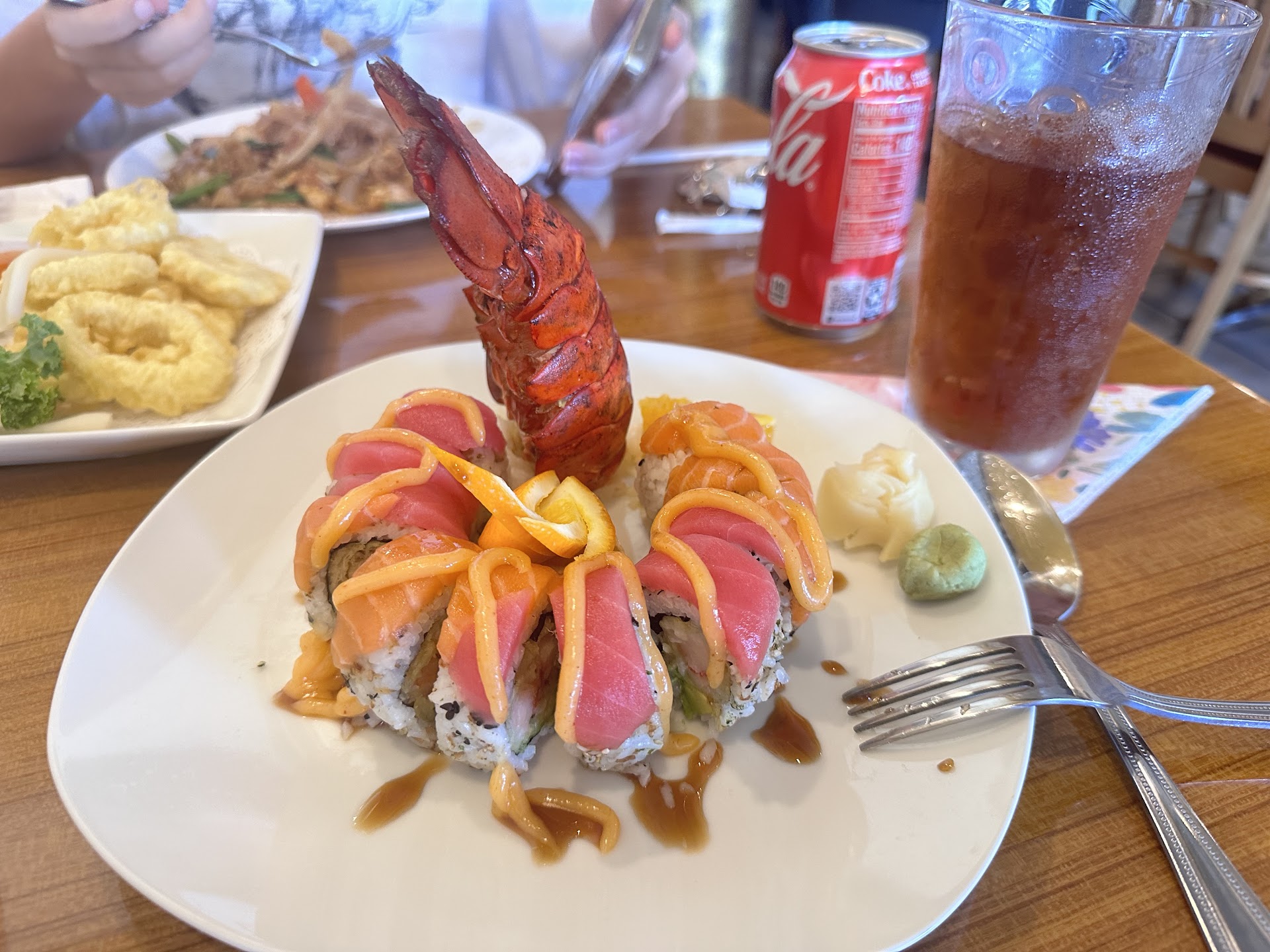 Moving on to the final item to be tasted on this foray into the sea of Thai/Japanese combo places, I direct your attention to the Lobster Roll. First, please take a peek at the picture of said roll. It is certainly a work of art to the discerning eye. With krab inside, fresh tuna on top and a wonderful spicy sauce drizzled to top it off, it looked far better than it tasted. I am fairly sure I got the last Lobster tail in the freezer as it came off slightly freezer-burned. If it weren't for that tiny, albeit important detail, this would have been a 5-star meal.