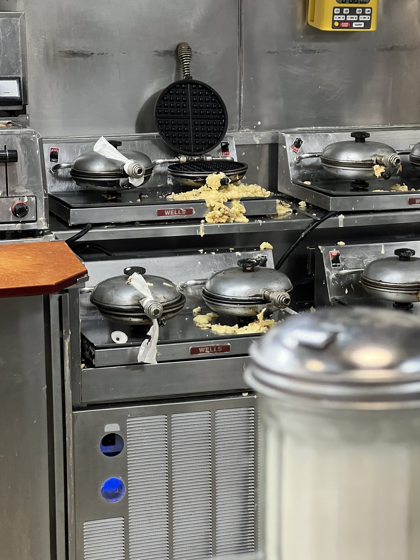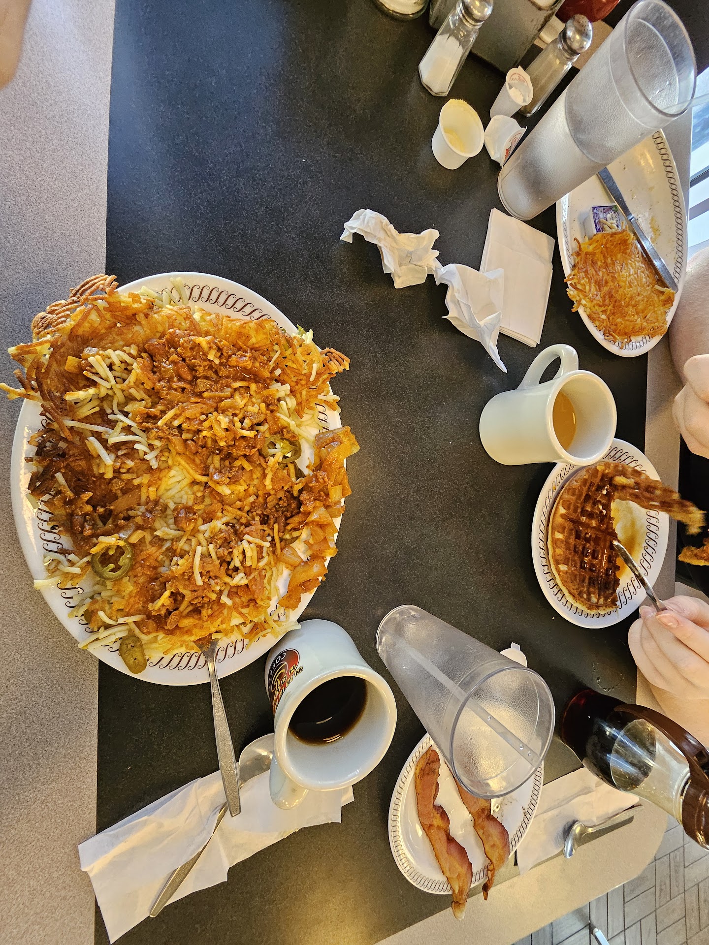 Read moreI arrived about 5:15 am and was the only one in the place. The cook “China” had her back to me cutting onions and a lot of them were falling on the floor. She slammed the knife down on the prep table that appeared to be anger. The onion fell on the floor and rolled into the broken floor drain. Finally the waiter (without name tag) soft spoken took my order. He appeared timid to verbally give the cook my order. I watched the cook wearing a pair of gloves pull her cell phone from the inside of her shirt and scroll through while cooking. Wearing the same gloves removed chopped jalapeños, ham and mushrooms with her hands wearing the same gloves. Later she began to clean the counter putting everything on the floor and she swept the wasted food up and handled other cleaning products and went back to handling uncooked and cooked food wearing the same gloves! She was also seen wiping her nose with her hand wearing the same gloves! When my food was ready she left it on the prep area while the waiter filled salt and pepper shakers, and took the trash out ignoring the food. Finally “China” turned around with my food and put it in front of me not saying a single word. The food was NOT as I ordered it. The place was absolutely filthy and the waffle makers were over flowing with...