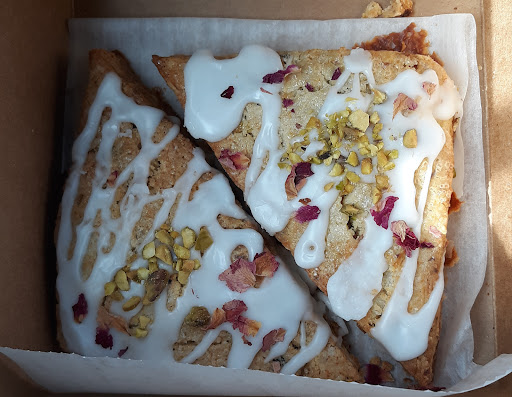 I called asking abt the pistachio vegan scones I'd seen in FB. I spoke to Hillary and she told me she may baked some the next day. She asked my name and asked me to call tomorrow to confirm that she baked them since that was my preference. I called the next day and the person said there was pistachio rose scones. I came in and asked and there were 4 left. I ordered 2 and a lady popped out from the kitchen. I asked her if she is Hillary and she confirmed. She asked me my name and I said we spoke yesterday. She said she was concerned about who was ordering 2 bc she remembered my call the previous day. Her and her staff are very nice and that scone is awesome!! I love pistachios so her scone exceeded my expectations!! It was my first time and I am glad I found out about her shop. I will return and recommend...