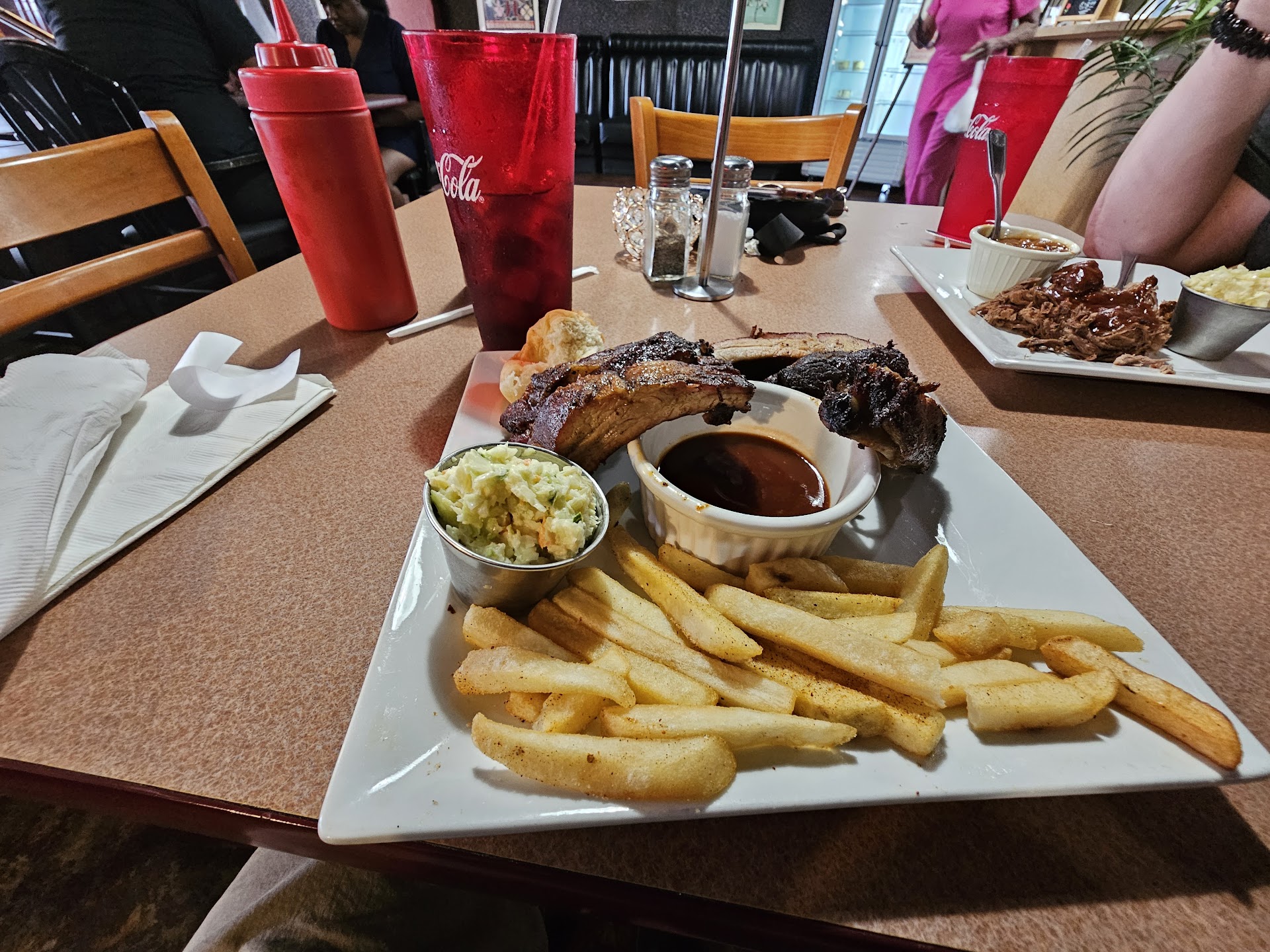 Read moreBeing from KC I can say I have had lots of BBQ so I feel I can speak well. First I like the style of my ribs with sauce on the side. Most places put so much sauce it overpowers the rib. Having it on the side is nice. These ribs were just a bit tough and dry in a few spots. I would go 3.7 to 4 only because of that. My fiance went with brisket since I did ribs so we can share and try different things. Sadly the brisket is chopped instead of sliced then topped with bbq sauce. Sliced is always better and this tasted more like a dry roast beef. Blame it on us for not asking but wished the menu reflected it. Roll was good, coleslaw while very small was good. Fiance loved the beans. I had seasoned fries and I really didn't taste much of the seasoning. We also had a peach cobbler alamode and it was good.