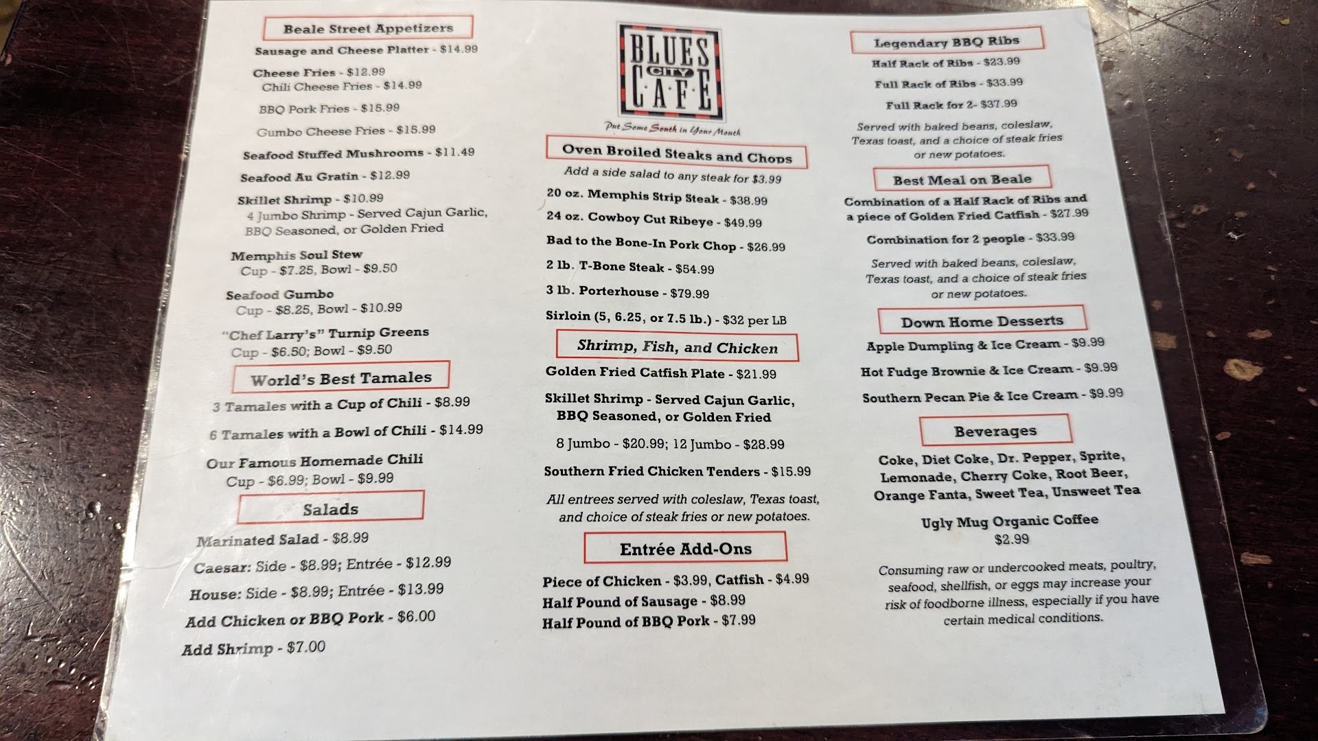 Read moreI visited Blues City Cafe in June of 2023 for the 1st time. The food was good, but the service was PHENOMENAL because of our server, Christian. My family and I visited last Thursday, December 21st, after the basketball game. We were celebrating my aunt's birthday. We called to see if they could accommodate 15 people. They told us yes. We got there and was seated right away. However, shortly after we were seated, everything started going wrong. The server was an older black gentleman with a HORRIBLE attitude and an extremely smart mouth. He was just plain RUDE! Two (2) of our family members left right away because of him. The remaining 13 of us stayed in hopes that things would get better. It did NOT! He spilled tea on 2 of our family members. He kept reaching across people and their food every time he brought something to the table. He was rude when people asked him questions about the menu. My husband mentioned something to the manager after he had had enough. We were told by the server that everyone's bill in our party would be discounted. The bills were NOT discounted when we received our bills. We inquired to our server. He then took $2 to $3 off everyone's bill. That is NOT a discount!!!!! After the HORRIBLE service we received and the money that we spent there, we should have been compensated. This was my aunt's actual birthday and dinner with our family that had come to Memphis from VA and MD to celebrate. I was EXTREMELY...