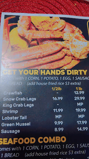 I'm highly upset and will never get seafood from them ever again,my mom and I were just there and my mom ordered the "get your hands dirty" seafood boil. Mind you that alone is over $80 bucks and only comes with 1 king crab,1 corn,1 egg and one potato no shrimps so my mom added 1/2 pound of shrimp and another king crab ok cool, we're thinking we're about to get a nice size boil that'll feed my mom,my son and self,the lady hands us the bag of course we look in it before leaving that bag was only enough to feed one barely 2 and the total came out to be over $100,so we asked the lady was that all of the order bc we were not expecting a kids meal. So to sum this up my mom and son ate the little boil that was supposed to feed 3 bc there was no way we could have split that...