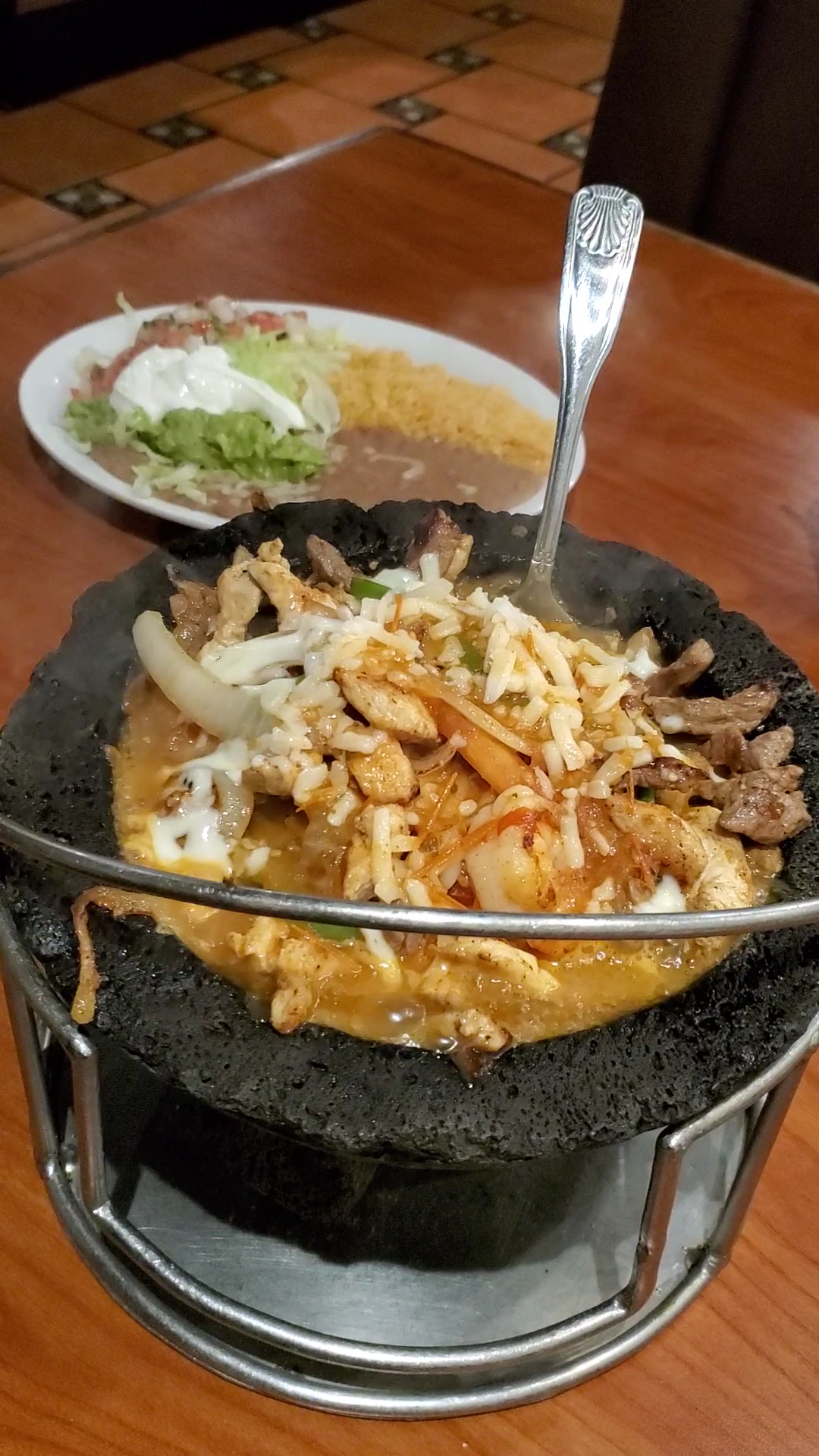 Read moreThis is my first visit here. They have a front and rear entrance and you are able to eat outside on the patio in the back. I was seated and greeted right away. They do give complimentary chips and salsa. The prices are very reasonable and I received a very nice portion of food for what I ordered. The reason I gave a 4 star on the food was for flavor. I had to put salt and pepper on everything I ate. Even in the salsa that came with the chips. The salsa is not a chunky salsa it is smooth. The dish that I ordered was called Molcajete. I want to say that it is served in a lave rock bowl (the bowl was deep) sizzling hot and stays hot the entire time you are there. That thing sizzles for a good 20 minutes. The bowl is deep. I did take the rest home. The meat was tender. You get about 5 medium shrimp out of the meat mixture. It is nice that they have the sea salt and pepper grinders at all the tables which is a much healthier and flavorful option for guest. But over all I would go back and try something different. I was just expecting a little natural flavor punch in the mouth without having to add anything. My bill was $22...