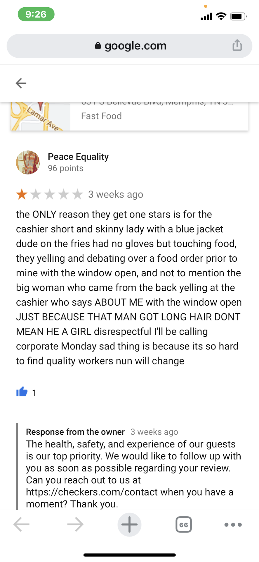 Read morethe ONLY reason they get one stars is for the cashier short and skinny lady with a blue jacket dude on the fries had no gloves but touching food, they yelling and debating over a food order prior to mine with the window open, and not to mention the big woman who came from the back yelling at the cashier who says ABOUT ME with the window open JUST BECAUSE THAT MAN GOT LONG HAIR DONT MEAN HE A GIRL disrespectful I'll be calling corporate Monday sad thing is because its so hard to find quality workers nun will change