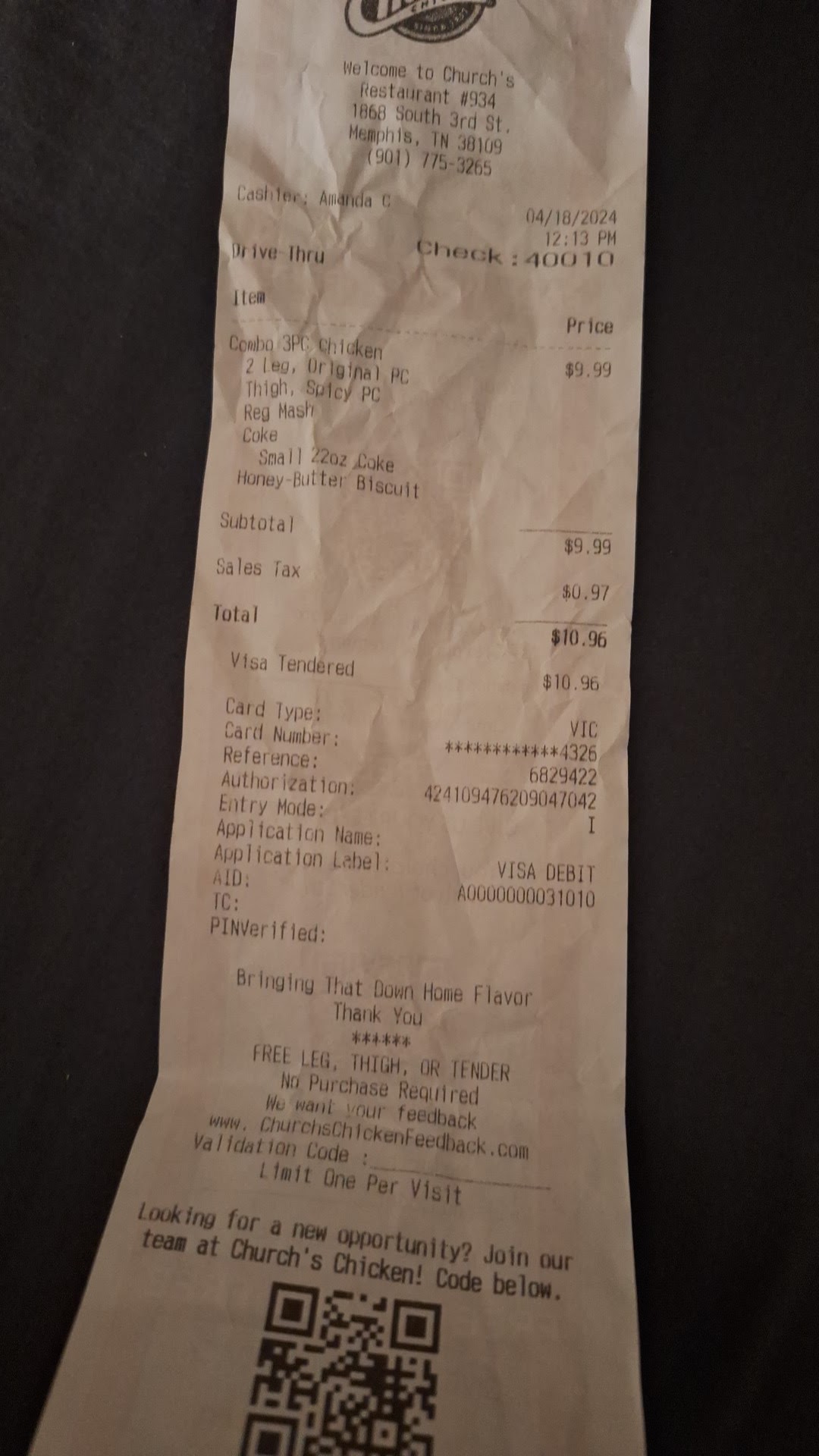Read moreI'm going to Church's Chicken at 9:40. I place my order for chicken tenders. She told me they were cooking them. At 951 I received my order. I drove off and went to work. Sort of happy that the chicken was going to be hot but not prepared for uncooked hot chicken that smelled funny . Tried to call them get no answer. I am going to count it as a loss and...
