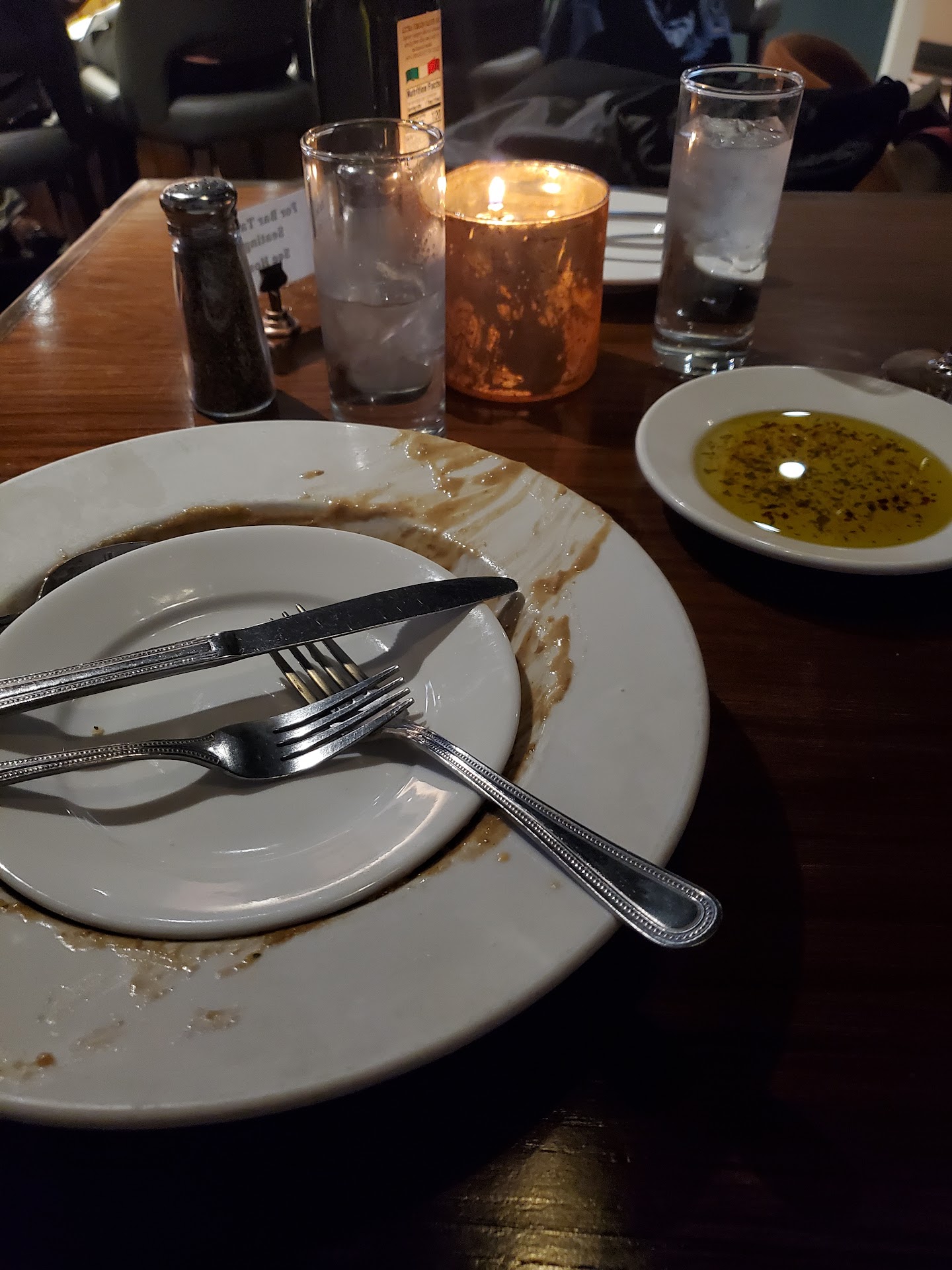We went here and lucked up on some good parking right up front, so when they told us about a 45 minute wait, we said "F-it, we are staying." We wound up waiting about an hour. Not a big deal, but slightly anticipated. The bread was bland. I guess maybe Italian is supposed to be, but im really big on something with more flavor, that the oil and pepper can compliment. The goat cheese dip, for lack of a new word, also bland. It was very heavy, and had poor texture. Now the star of the show, Chicken Marseille. This was actually very good, the closest I've ever found, to my favorite Macaroni Grill dish "Chicken Scallopini", minus the artichokes, mushrooms, and prosciutto. The service was very stale for a place with such a price tag. It was almost as if my ordering of a water diverted our server's attention elsewhere. I didn't order it to be cheap. I ordered it because I don't drink and drive. It may be possible that it was because me and the wife chose to split a main course. However it seemed to set precedence of the rest of our service. In fact, once we got our dishes, our server never revisited our table until our plates were empty and stacked. I never got a water refill for my meal. We will be back for that one dish. But 20% is a top tip for poor service. It's now been a couple weeks, so we decided to try it again... 30 minute wait, then got sat at a high top in the bar. Watching a number of servers pass us, some even debate in the hallway, my wife asked, "you wanna just leave?" Finally after 12 minutes a server introduced herself. She took our drink order, put some oil on the table and said she'd bring us bread. She came back with our waters, and asked about an appetizer. We declined an appetizer, as we had already selected our entire meal, with our menus folded and placed on the far corner. She said, "I'll be right back with your wine." When she returned, she took our order. She brought our salad, and as last time, she didn't return to our table until we were nearly done with our main course, brought out by someone else. She asked if we wanted dessert as she gathered our plates. I was hoping that she noticed, the oil for our bread remained untouched, because we never got bread... but at least this time I remembered to get a picture. On the drive home, my wife asked, "What is it about how we look, that we don't get the service, we watch...