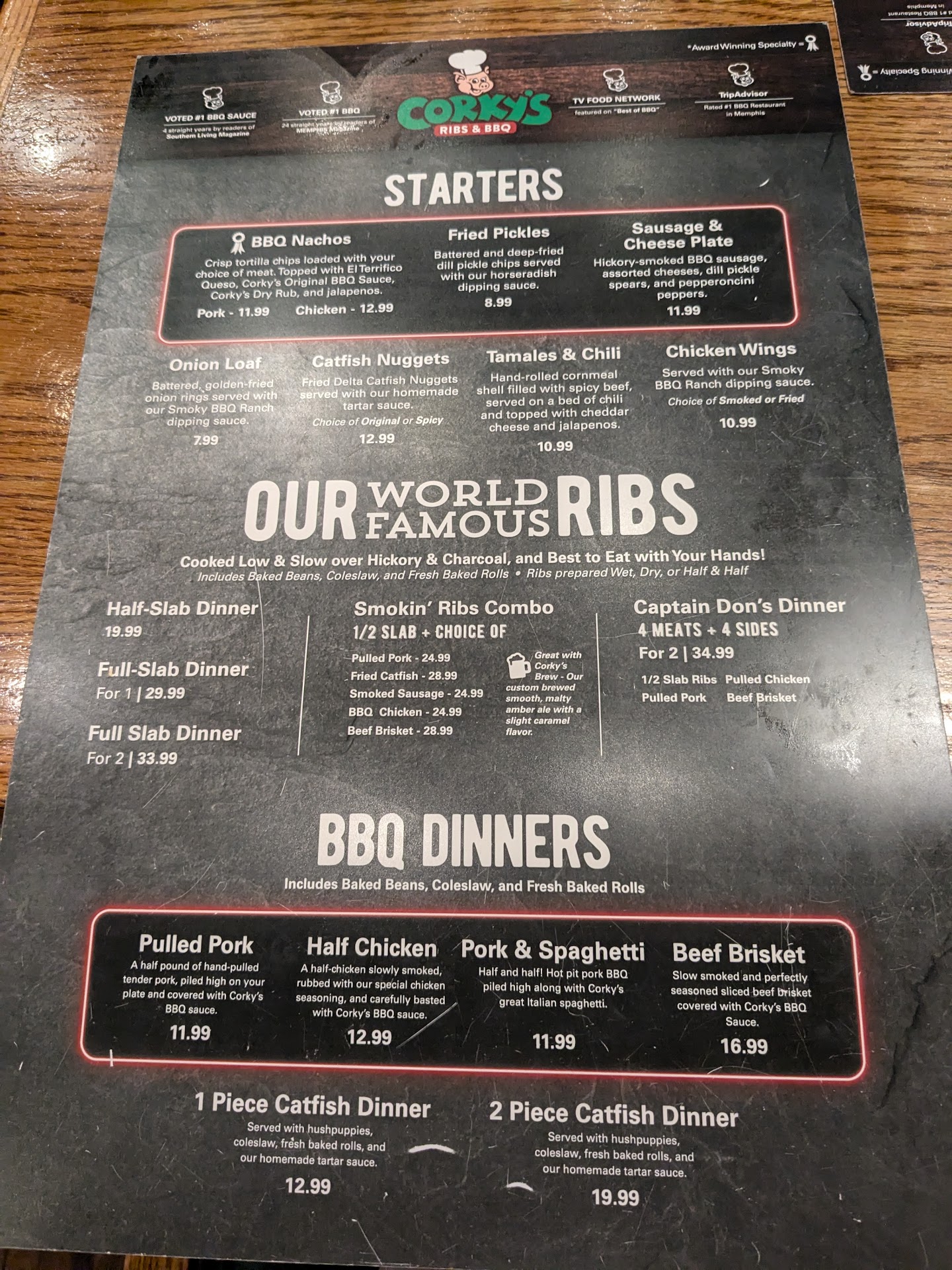 Read moreThis was my first time trying Corky's. I'm itching to go back! The interior esthetic was one of the most impressive I've seen of a BBQ joint. I got a kick out of the bottle cap wall that greets you at the entrance. There was a lot of neat decades-themed pop culture artwork hung on the walls and matching music playing over the speakers. Our waitress was very enthusiastic, friendly, and accommodating. And now the food... Corky's definitely gives a good argument for being one of the best BBQ spots in Memphis. We had the onion loaf and rolls as an appetizer. The rolls were top notch. The BBQ ranch that came with the onion loaf really tied everything together (I even dipped my rolls in it). On the waitress' recommendation, I tried a full portion of the Pulled Pork Nachos as my entrée. These did not disappoint! There were a few ways to customize this. I added jalapeños and chose white queso. The jalapeños gave just the right amount of kick. The queso wasn't runny and held the meat on the chips well. The pulled pork was very tender and juicy. You really can't ask for anything better from a plate of nachos! I got to try a bite of the Spicy Catfish Nuggets from my family member's plate... they aren't playing around with their catfish! The nuggets seemed to have been doused in some kind of buffalo sauce, but they weren't overwhelmingly hot. I started to regret not ordering those nuggets! If you're ever in Memphis, don't miss...