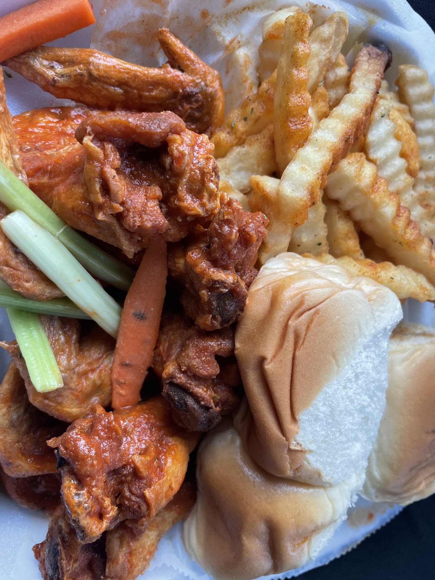 Now, let's talk about the sides. The fries are seasoned to perfection, with a delicate blend of spices and salts that add an extra layer of flavor. When paired with the fresh celery and carrots on the side, the combination is heavenly, balancing the richness of the wings.