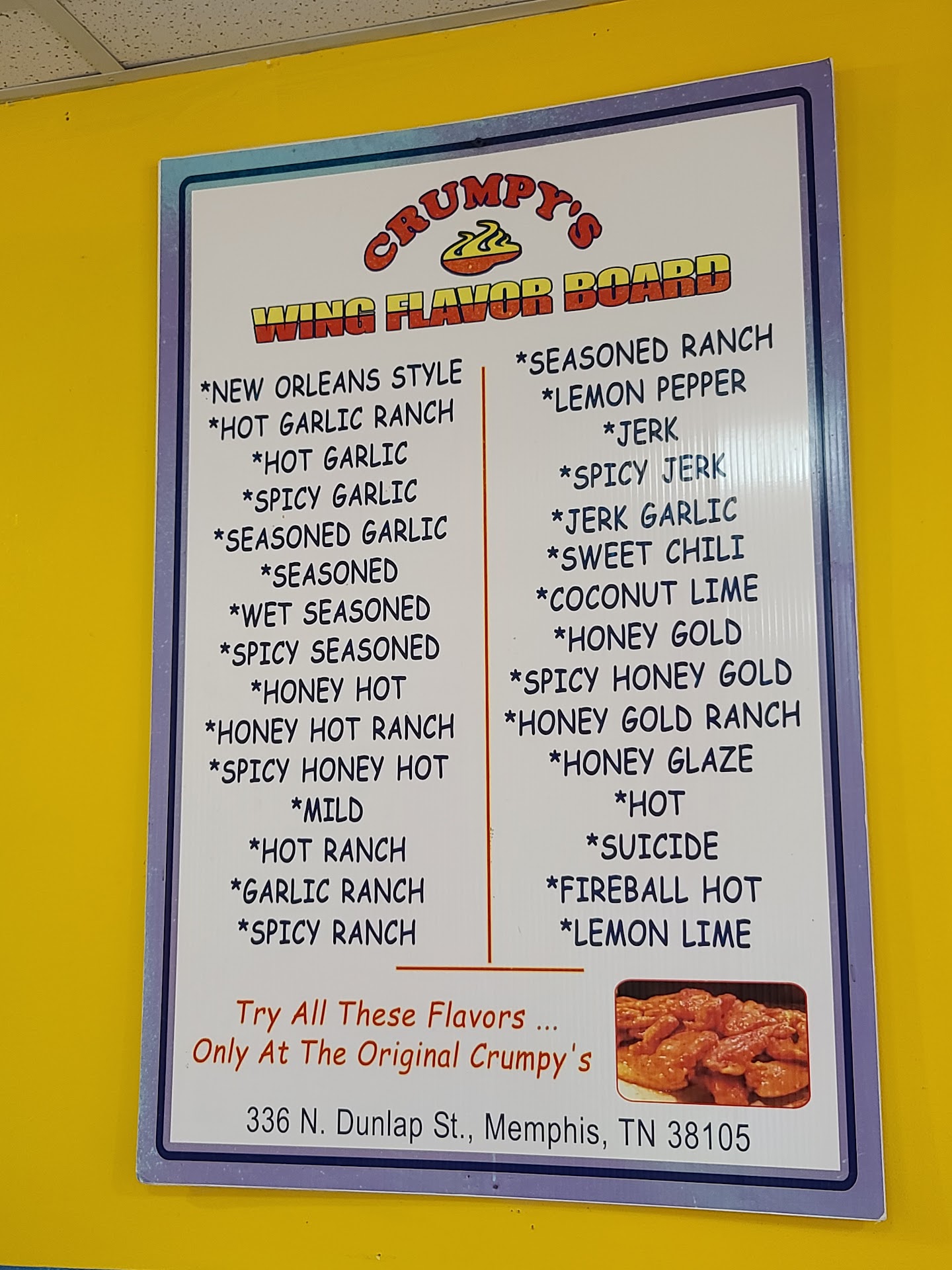 Earlier I said most wing places in Memphis are cookie-cutter, carbon copies of each other. At this Crumpy's, there's one person who makes this location worth the drive and stand out. His name is Loco. There may be 1000 people in front of him placing orders, but he doesn't miss a step. He has patience, poise, and an amazing smile.....EVERY time. He gives everyone the attention and respect they deserve. He provides great service. Customer service makes the difference. That's how you set yourself apart from the wing crowd in Memphis.