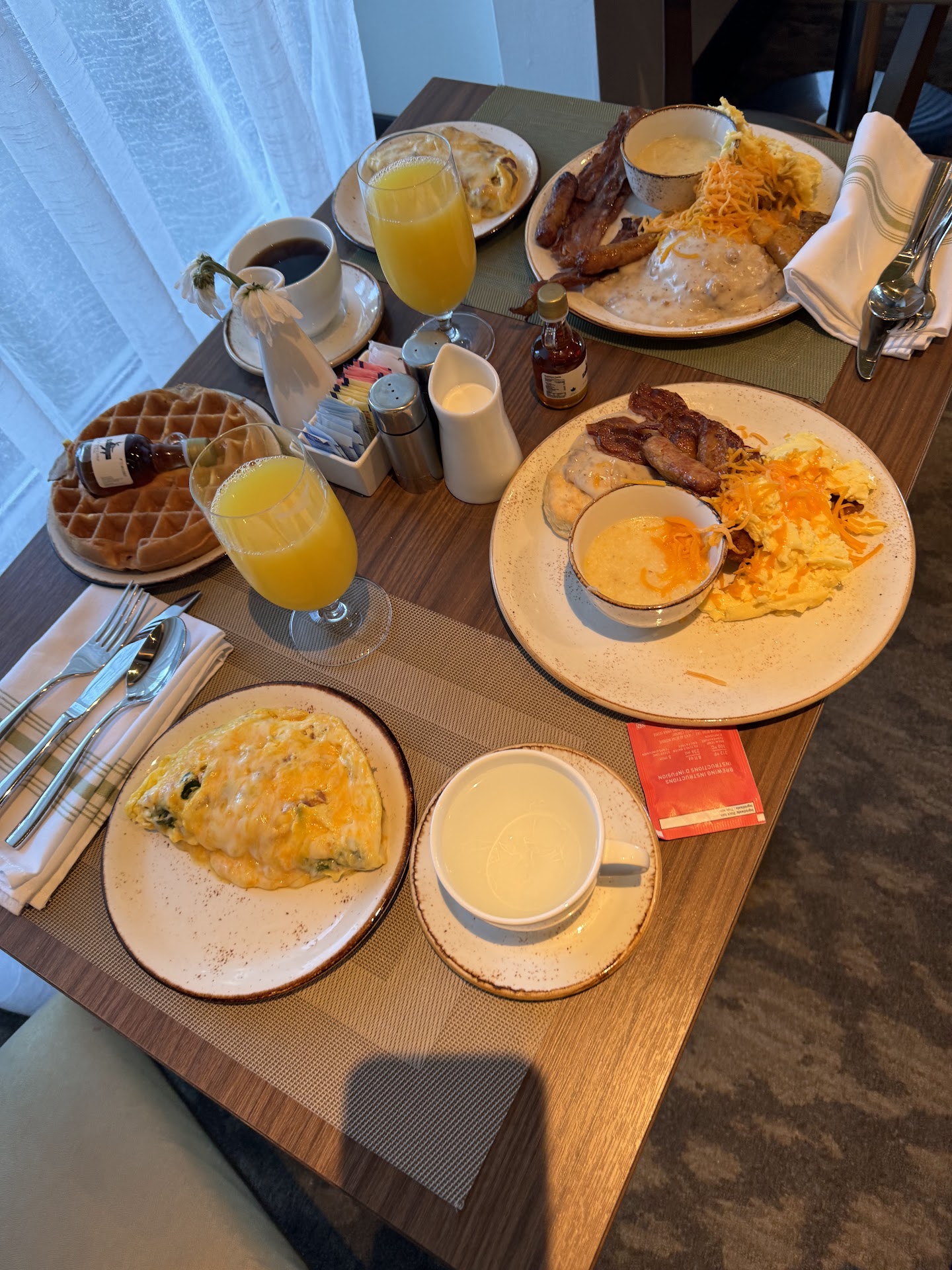 The breakfast buffet was self-serve and well-stocked with hot, fresh options. There were scrambled eggs, bacon, sausage, potatoes, grits, biscuits with gravy, pastries, and a variety of fruit, yogurt, cereal, and milk. The juice bar offered orange, cranberry, and apple juice, and there was also an omelet station with an attendant.