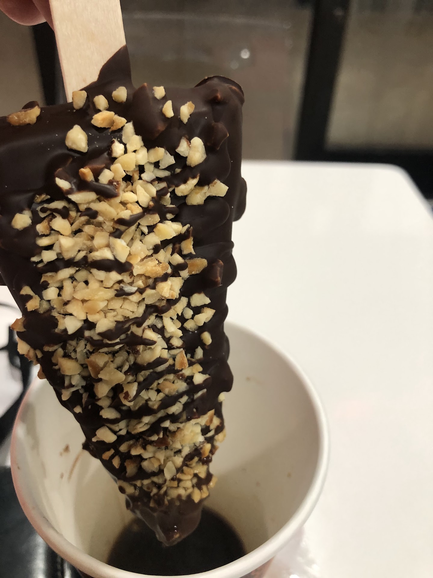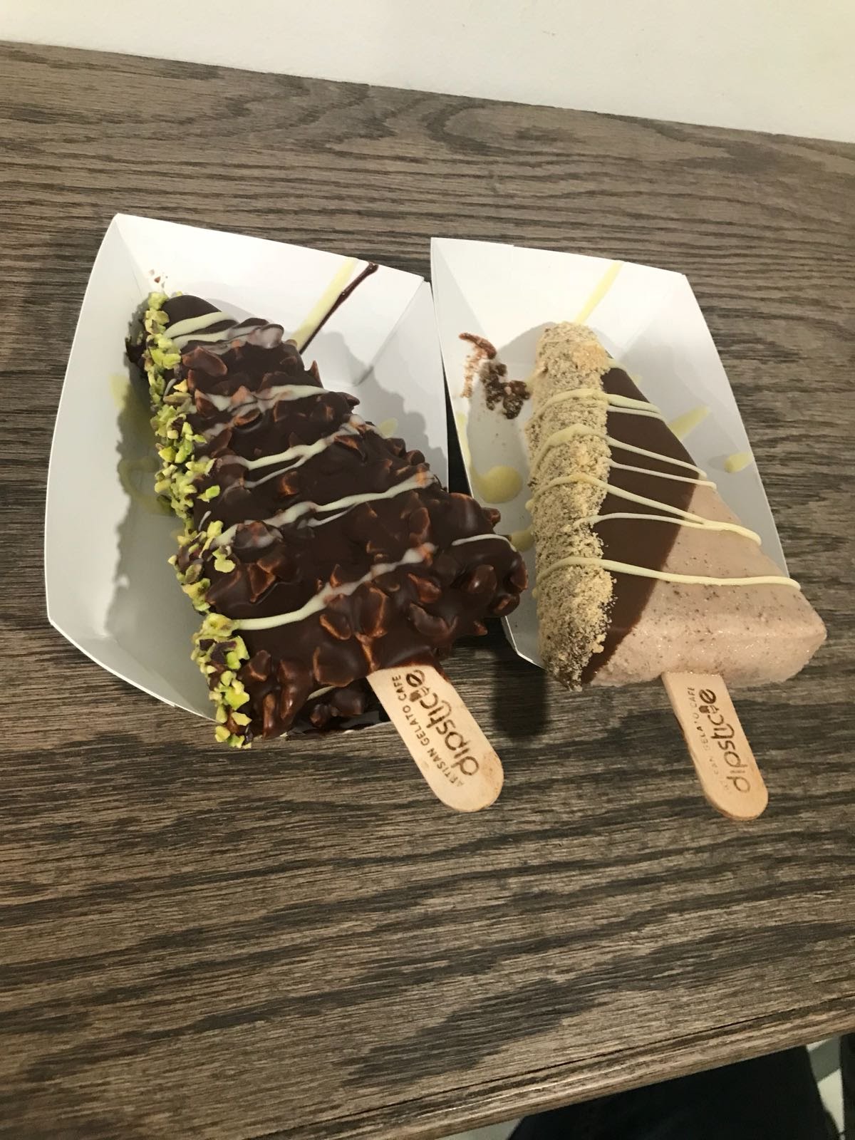 Good ice cream, but is this a gelato? I came here for affogato. The chocolate gelato on stick was quite a huge in size. They asked about the dipping coat, and I preferred the dark chocolate one, and hazelnuts on top. Overall the Ice-cream on stick looks very tempting. The lady asked if I want my stick inside the coffee or not. For uninitiated, lemme clarify, affogato is a speciality coffee ( Italian) where a strong shot of hot espresso is served with one or a couple of scoops of gelato - traditionally vanilla ( can be replaced by chocolate or anything). So the cold gelato will melt and the strong espresso will mellow down with the molten gelato. You must devour the entire thing together by sipping and with a spoon. Here, the gelato was in stick, the gelato looked better than the actual taste. The coffee was very basic. I’m usually picky about the coffee standard. Here the espresso tasted like bitter water ( no aroma, or taste). So it was not a good coffee or good affogato. The ice cream was also not great if you count that as gelato. But if you compare it with a basic ice cream,...