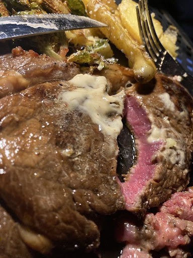 So the ribeye comes out with the butter on top. Looks GOOD. I saved room and didn't eat lunch with the expectation of being blown away. I ignored the fact that the ribeye was somewhat flat. Cut into it and it is RAW. I always eat medium rare, it's the only way to eat a steak! This was RAW.