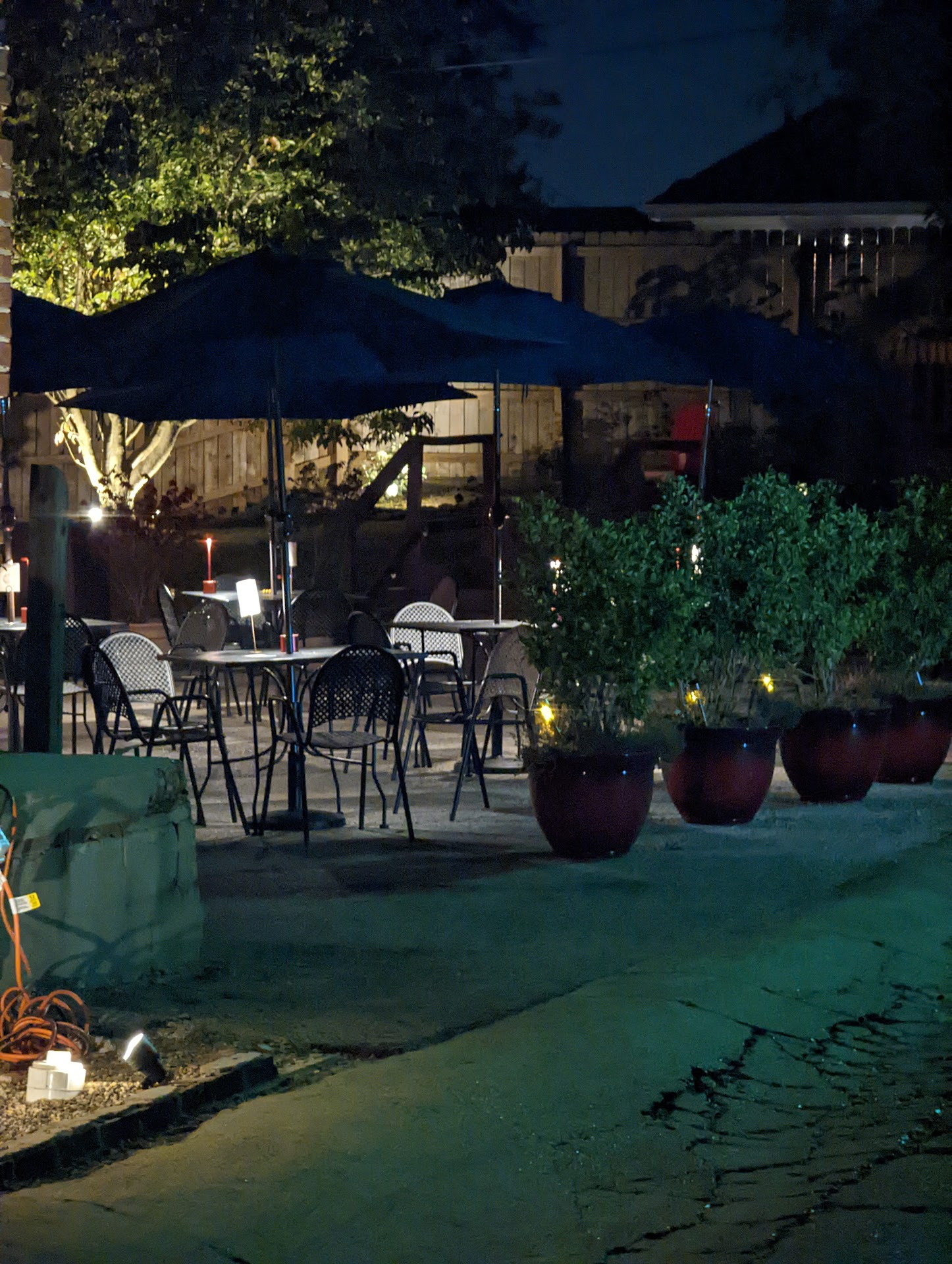 Pros: 3 outdoor patios where you can eat. One very small one out front with about 4 tables very close together. You can hear everyone else's conversations. A bigger patio is out back with more tables and more room in between tables. There is also a 3rd patio that is actually covered and, of course, they have indoor seating. The back patio is cozy at night with some nice ambient lighting at each table. Drinks are good. I had the Easy Tiger and the Mondo. My favorite was the Easy Tiger, it has Thai tea and liquor, very good! The mondo was also delicious. My spouse loved the charcuterie board.