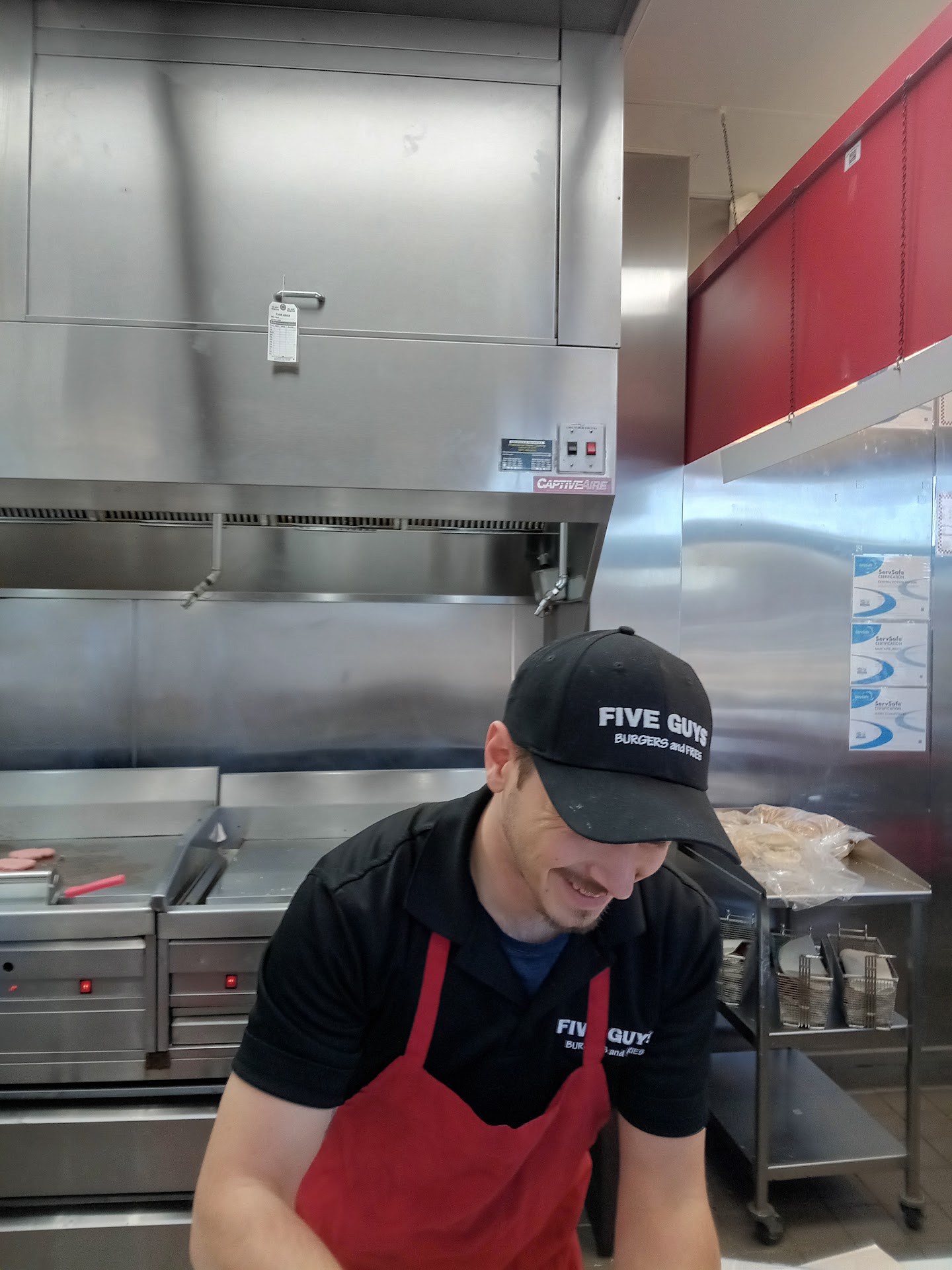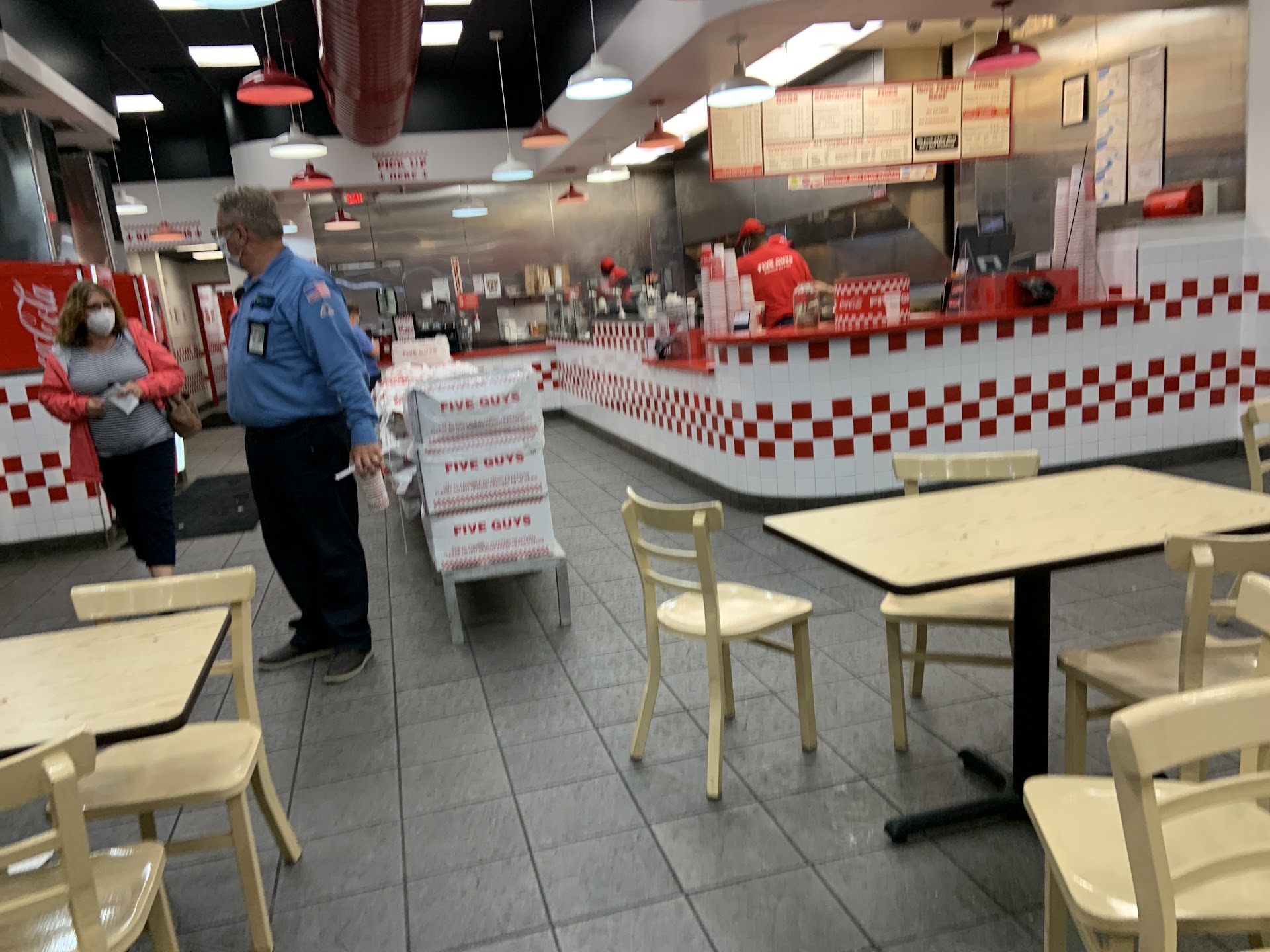 Read moreI just left five guys walking to my car thinking to myself “wow what a great experience I’ve got to write a review.” I walked in and was greeted by the three guys behind the counter in a appropriate way not too loud or scripted but very friendly. I went to the bathroom to wash my hands before priding the bathroom was clean. I went to the counter and one of the guys who was actively assisting the line said “I’ll be right there as he started to walk my way.” I told him I needed a minute he was said take my time then went back to helping. When I was ready I looked up at him and he asked if I was ready and I said yes and he came and took my order. I wait a few minutes then my order was ready. Mother guy called out my order in a loud enough voice I heard him. I was moving slowly and fully expected him to place my order on the counter but he stood there until I walked up to grab it from him. He smiled at me and told me to enjoy or something along those lines. I haven’t been to a five guys in a bit but after this experience I will be back...