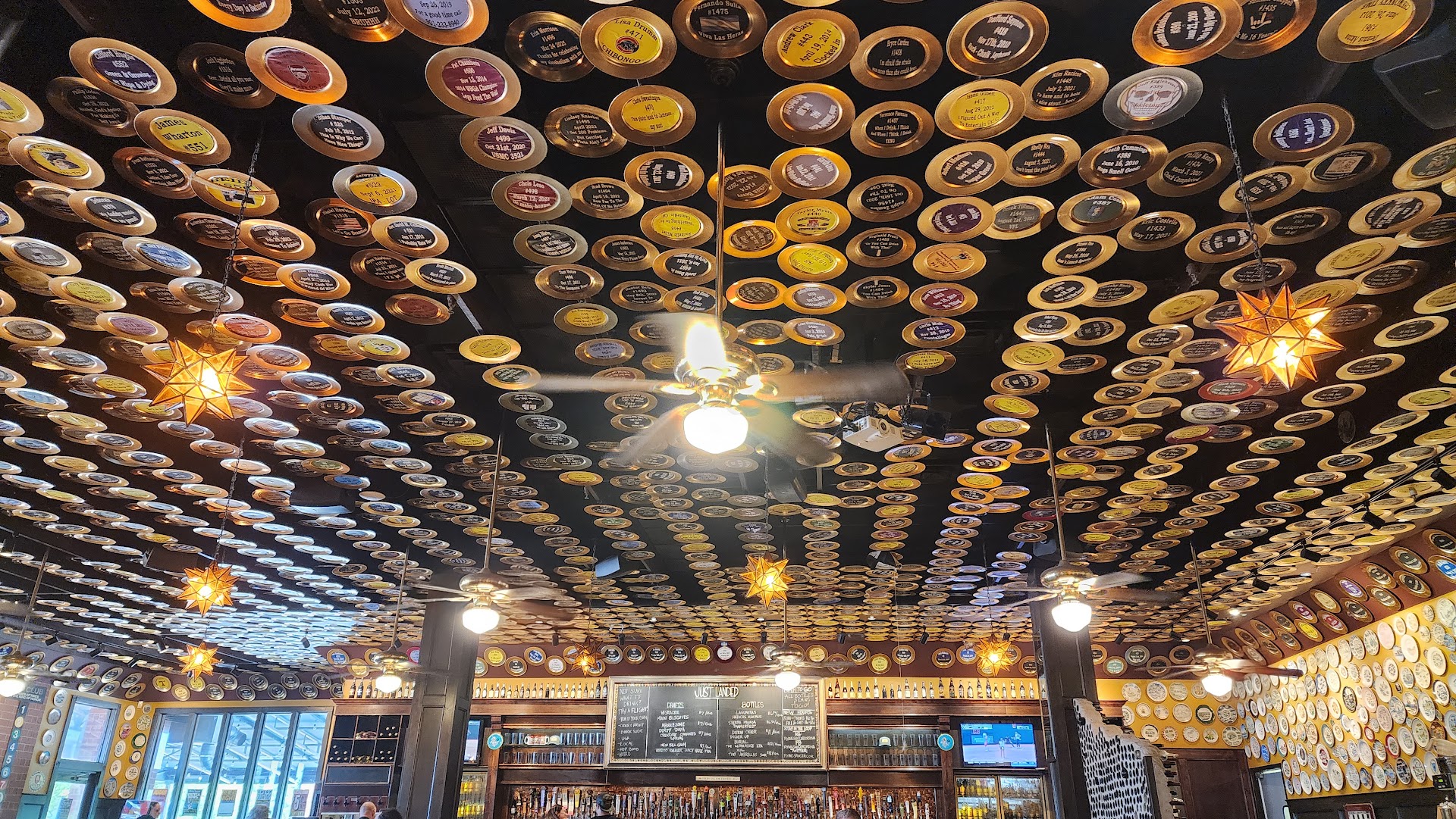 We had lunch here on the weekend. We were a little worried because the parking lot was pretty full, and a lot of people were seated outside. When we entered, there was a lot of inside seating available. The decor was an upscale pub vibe, dark wood, brass, and mirrors. There was a seating area in the corner with couches and chairs that looked like a living room set up. Everything had a lived-in feel but was clean and welcoming. The ceiling was covered in plates with various customer names, organizations, and artwork.