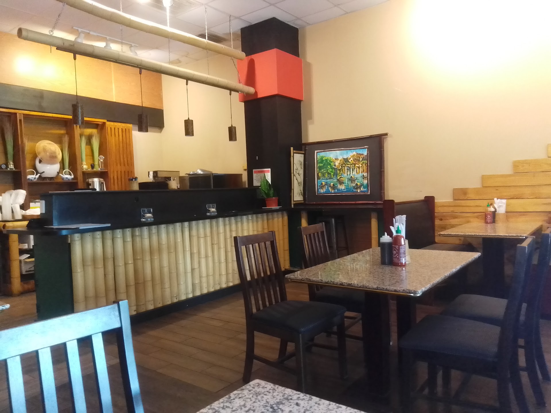 So letâs start with the good. The iced coffee was very good and nice and sweet. It was a nice drink for the early evening. The pho was decent and the stir fry with crispy noodles had a very tasty sauce. Overall the taste of the food was great. So hereâs where the two star rating comes in. We were expecting a nice quiet dinner. Instead there was an old man rambling into a microphone and playing blues. At a Vietnamese restaurant. It mightâve been ok if he didnât amplify his guitar and voice. In such a small space it was obnoxious. And weird. Just after we got our food the place got slammed with take away orders. I donât think it was anything extraordinary for a Saturday evening but the serving staff got really overwhelmed really quick. So overwhelmed they forgot about the dining room. We waited a good while for our check but it was clear weâd have to go to the take away counter to get it. So I guess they remembered us as we were walking so we were told the check is on the way. This actually wouldnât have been an issue but Old Man River was right behind us with his amplified memories of when bread was a nickel doing his best Randy Newman impression so we were over it pretty quick. Unfortunately we got a parting gift from the kitchen. We both got horrendous diarrhea. My husband had it worse so weâre thinking there was something up with the stir fry because he ate most of that dish and I only had a couple bites. So our date night away from the kid was obliterated. I honestly think the 2 star rating is generous but the iced coffee was really that good and the servers...