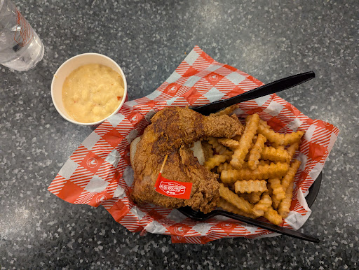 Read moreHonestly Hattie B's fried chicken is the best fried chicken I have eaten in Memphis by far. I went in early March with a group of friends. When we arrived, Hattie B's was packed inside, so once we ordered, we had to sit in their enclosed outdoor patio. Luckily there was some heating, but not a lot, as it was still chilly out. I ordered the Half Bird Dark Meat with the Pimento Mac and Cheese and a side of fries. This is the order you want to get if you go to Hattie B's. First, let's start with the mac and cheese. At a lot of restaurants, the mac and cheese will either be cooked well but not enough cheese, or it will be cheesy but incredibly dry, or it just won't be seasoned. You won't experience that here at Hattie B's. Their mac and cheese was incredibly cheesy thanks to the pimento cheese, and it was seasoned beautifully with salt and paprika and thankfully, the pasta itself was not dry. Second, the fries. The mac and cheese was well seasoned, but the fries were WELL seasoned. Honestly you don't even need ketchup for these fries. The best is saved for last. The chicken. At most fried chicken places, the biggest concern is grease and dry chicken. Those worries don't exist here. The chicken at Hattie B's is so juicy, I swore it melted in my mouth. I got the medium spice level for the chicken, but that spice still packs a punch, but not so much so you're only tasting spice. No, you still get to taste the flavorful breading and the juiciness of the chicken. I wish I could come...