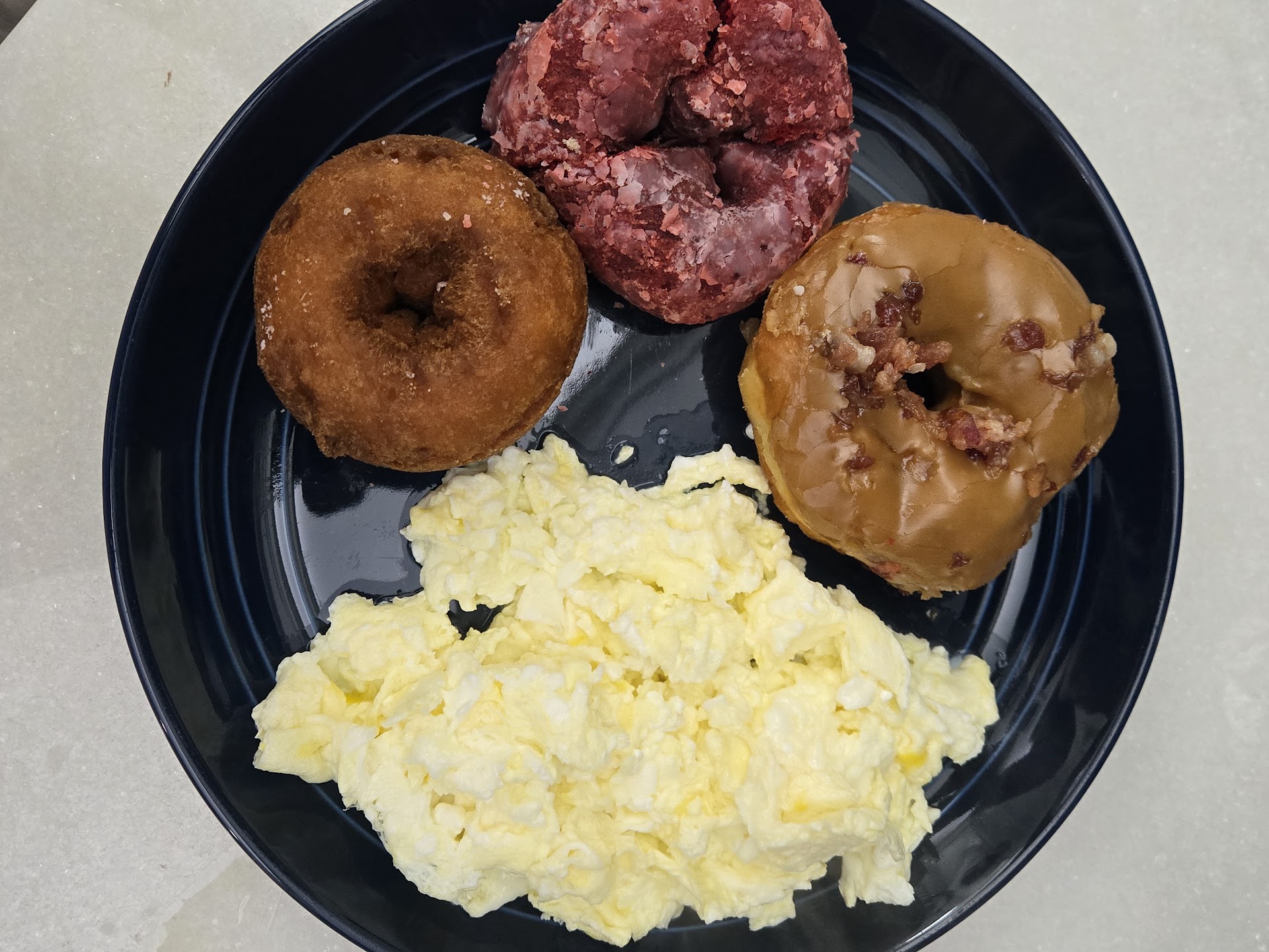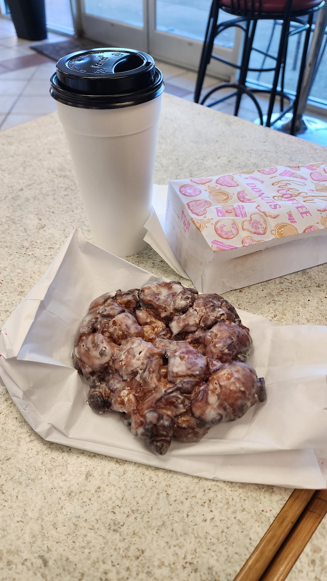I finally tried Howard's donuts and I am so impressed. The reason I had not gone before is because I am 20+ minutes away, so it just wasn't convenient. I went about 1p on Tuesday, no one inside but drive thru was steady. Was happy to see the large selection to choose from. It was a hard decision, but I got the red velvet cake, the plain cake and the maple bacon. All of them were delicious. The bacon on the maple donut was perfectly cooked. I think it has a hint of glaze on it to make a sweet and savory taste. Definitely a must try if you haven't had one before. Red velvet was so soft and it just melted in my mouth. The cake donut is a fav and I think a perfect add when you are eating other donuts that are sweet. At home the next morning, I slightly warmed them for 15 seconds in microwave and then added some protein, (eggs) that i prepared! My husband had the apple fritter that he enjoyed. I took a bite. Loved the soft inside and slightly crisp...