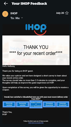 This location is horrible and needs to be shut down. There is no customer service and are very dismissive of their paying customers. I recently placed an online order and went to pick it up to go. I arrived and waited for the host to come to the counter and she asked me was I dining in or carry out. I told her that I had already placed and payed for a to go order. She asked my name and she went to the back to check. She came back and said that the order was not there. I showed her the online receipt and where I had payed for the food at the location. She said, It's not here and I can't help you. A large party arrived behind me and she proceeded to dismiss me and went to the person with the large group and asked them how many. I said excuse me, our business was not finalized. She ignored me and yelled for the manager and said very loudly, this group is mine and I need it and I have a problem that needs to be handled at the front... the manager was a young lady with a red shirt and I continued with her and had to reexplain to her the so called problem. I showed her my receipt and she went to the back and she told me that there was nothing that she could do but re take my order and pay for it again. I said no thank you, just give me a refund. She said that's not her problem and that I had to email ihop myself. She then proceeded to help the hostess with the large group that had arrived. I left very upset, hungry and disappointed about the whole experience. It had been the rudest experience I've had at an establishment. I wasn't expecting a fine dining experience or food but that was just outrageous. That whole place needs to be rehauled or just shut down if that's how they will run it. I should have just grabbed a breakfast burrito from taco bell from next door. The email response is a joke. I have yet to here from an...
