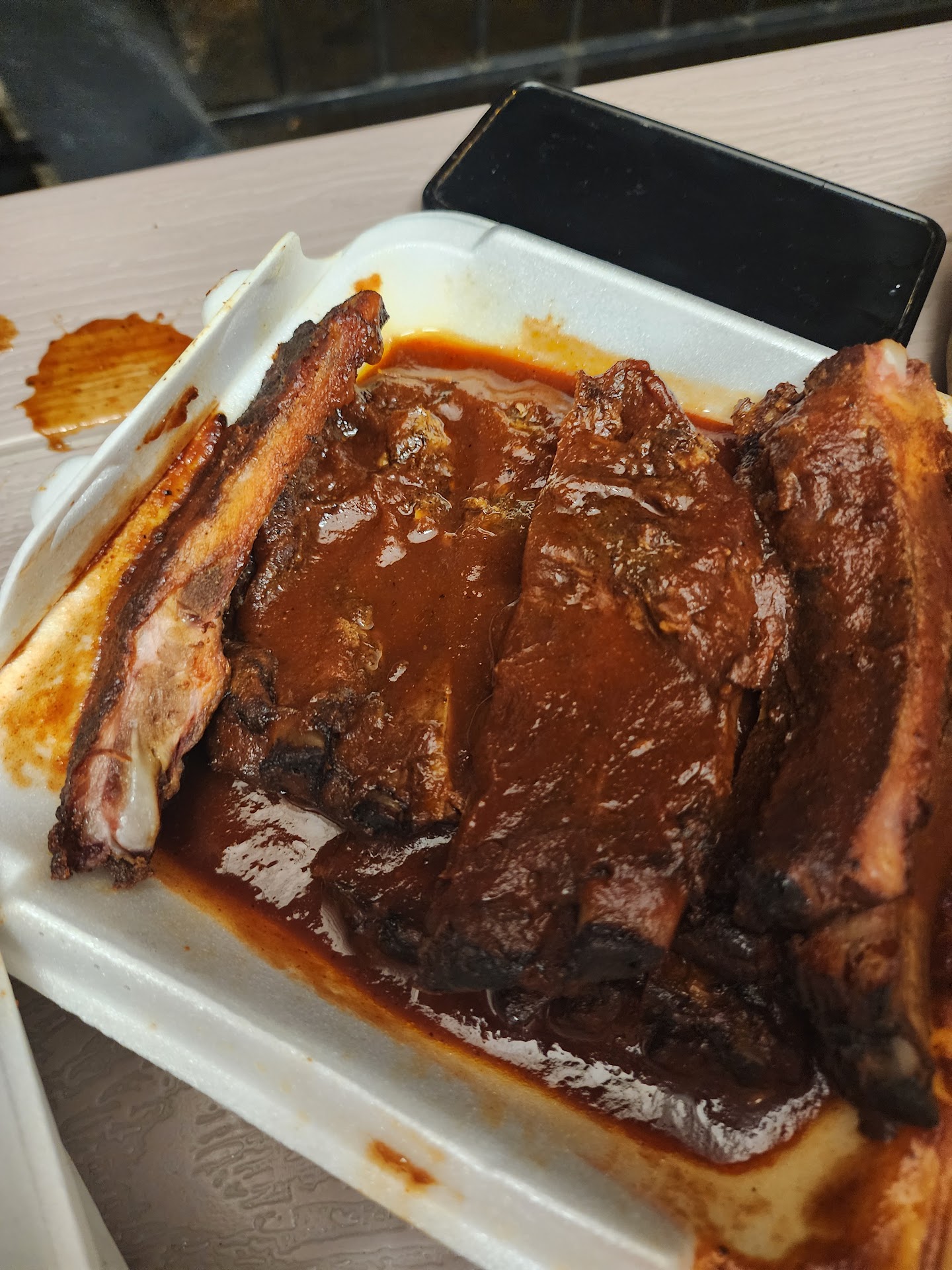 If I could give negative stars, I would. There are so many terrible things about our experience here, but I'll start with the worst one. THEY SOLD US ROTTEN MEAT. You read that right. We paid $35 for a slab of beef ribs that smelled of ROT at the first bite. I mean, it's like they pulled them out of the dumpster to put in our box. After that, we were too scared to eat the potato salad or coleslaw because if you sell rotten meat, there is no way you keep cold things at the appropriate temp.