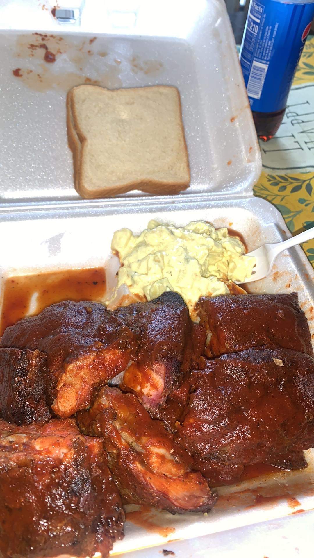 Read moreIf I could give negative stars, I would. There are so many terrible things about our experience here, but I'll start with the worst one. THEY SOLD US ROTTEN MEAT. You read that right. We paid $35 for a slab of beef ribs that smelled of ROT at the first bite. I mean, it's like they pulled them out of the dumpster to put in our box. After that, we were too scared to eat the potato salad or coleslaw because if you sell rotten meat, there is no way you keep cold things at the appropriate temp.